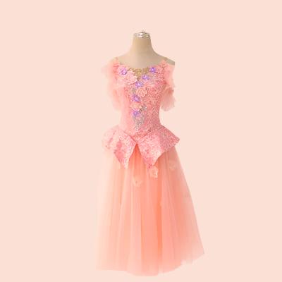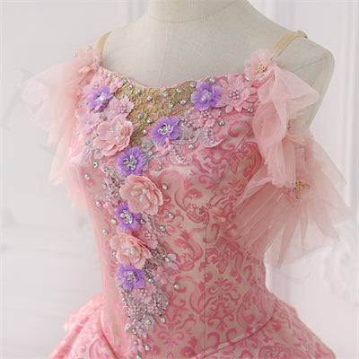 Nutcracker Waltz of the Flowers, pink Romantic tutu. Pink embossed jaquard V shaped bodice with matching tutu skirt. V shaped bodice with flower shaped basque. Rich pink and lilac flowers decorations across the bodice, embellished pink and lilac pearls, sequins and crystals.