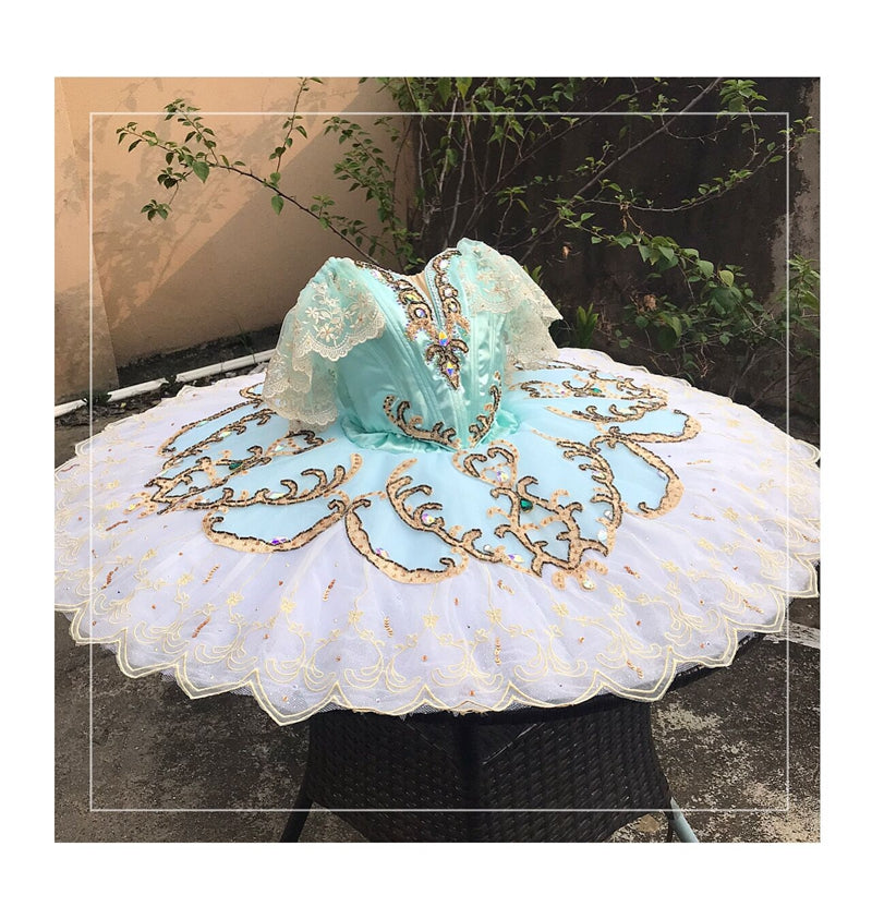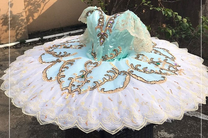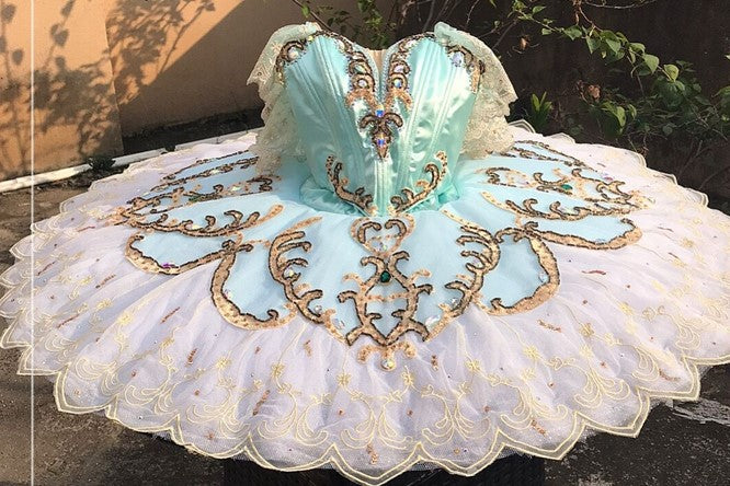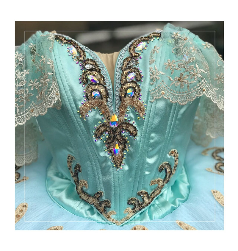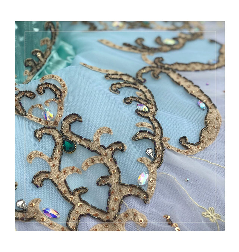 The V-shaped bodice of this professional tutu is made with silk shiny satin in a wonderful shade of aqua green. The decorations are extremely rich. We have used gold appliques, golden and black small crystals, silver trims and crystal diamonds. There is a long V cut in the front, and a nude insert. Ivory lace sleeves are attached to the spaghetti straps.
