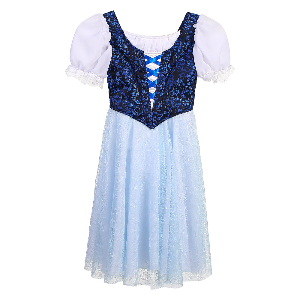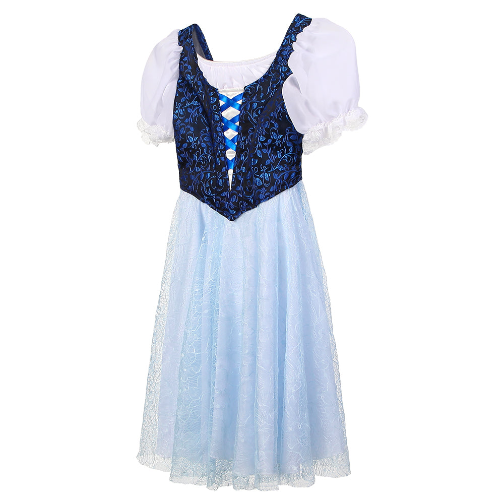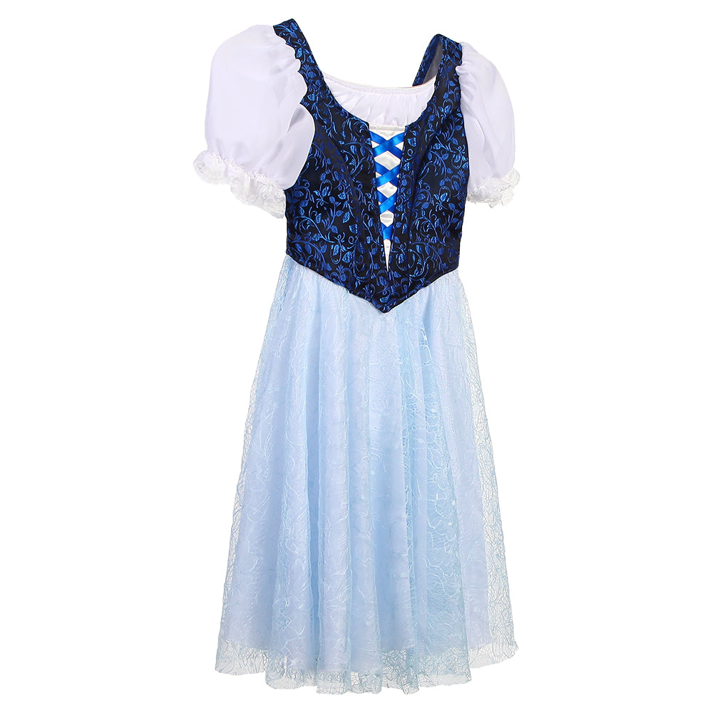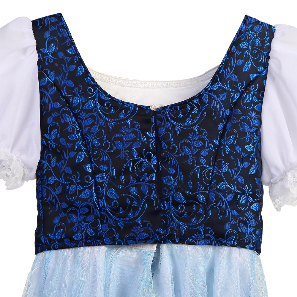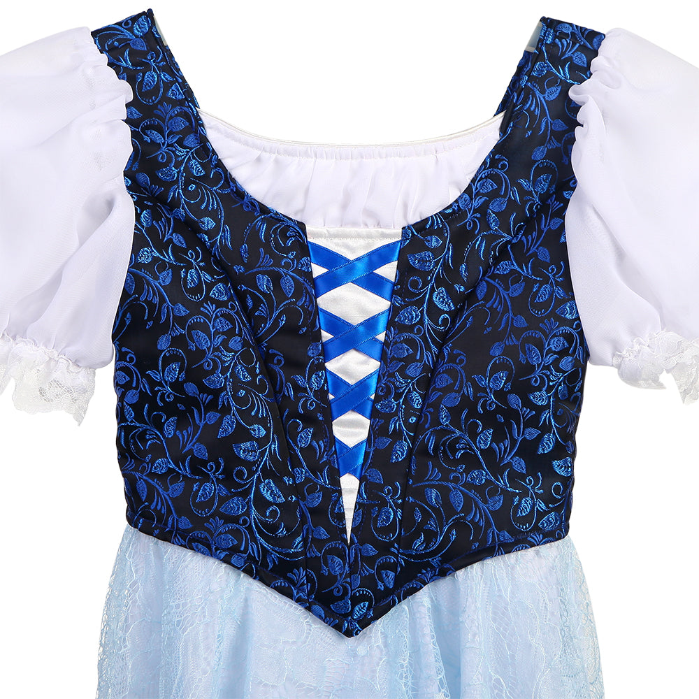 Blue and black brocade corset, with blue laced pattern and white undershirt. Short white sleeves and hooks and yes closure.