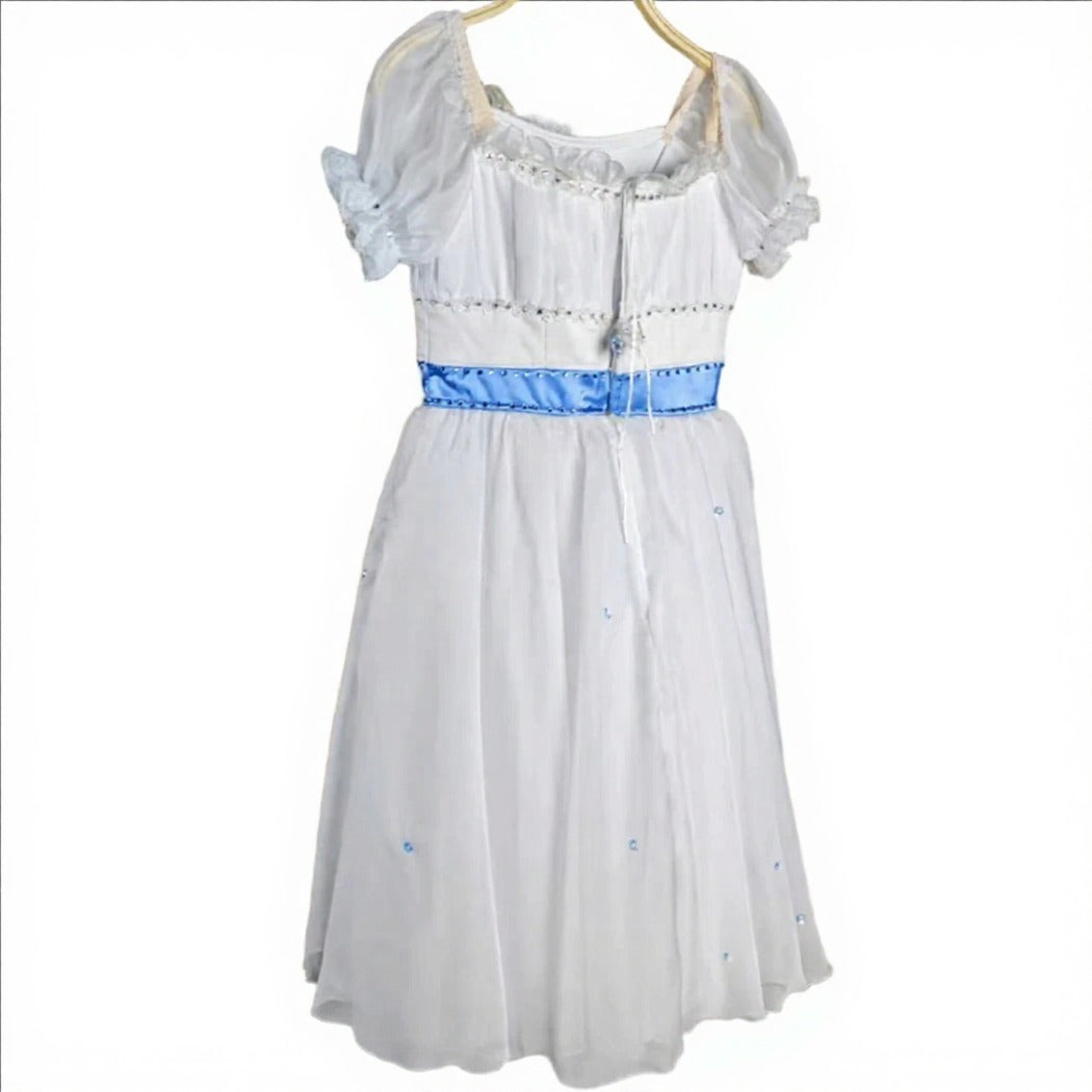 An exclusive professional costume for Clara in the party scene. This delightful dress is made with white chiffon and blue satin decorations. The upper part of the costume feeatures pleated white chiffon, balloon sleeves, hooks and eyes closing, rhinestones, and a beautiful blue satin incorporated belt. The knee-length skirt features two layers of white chiffon.