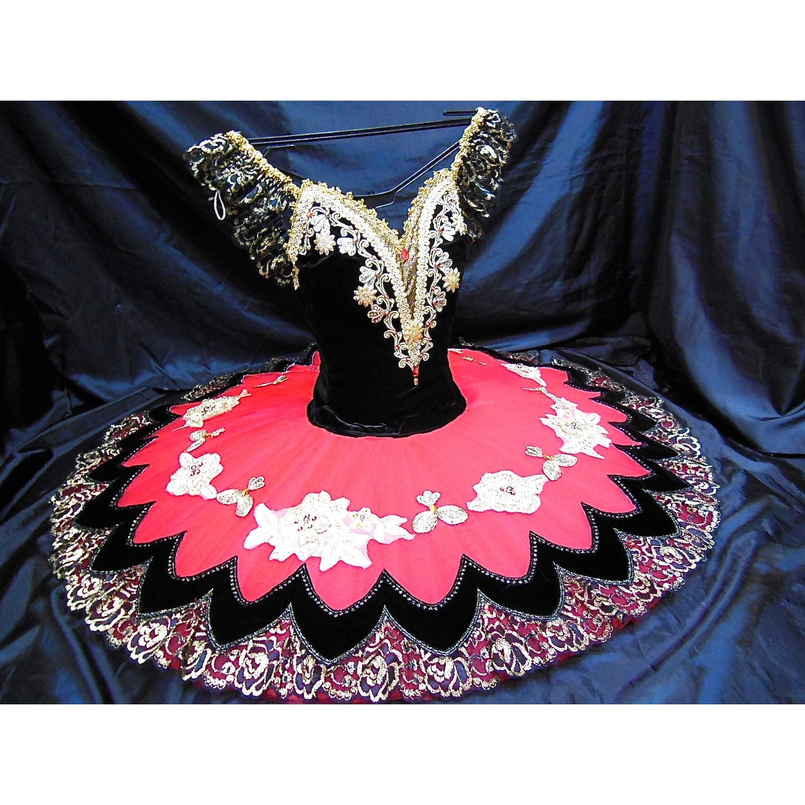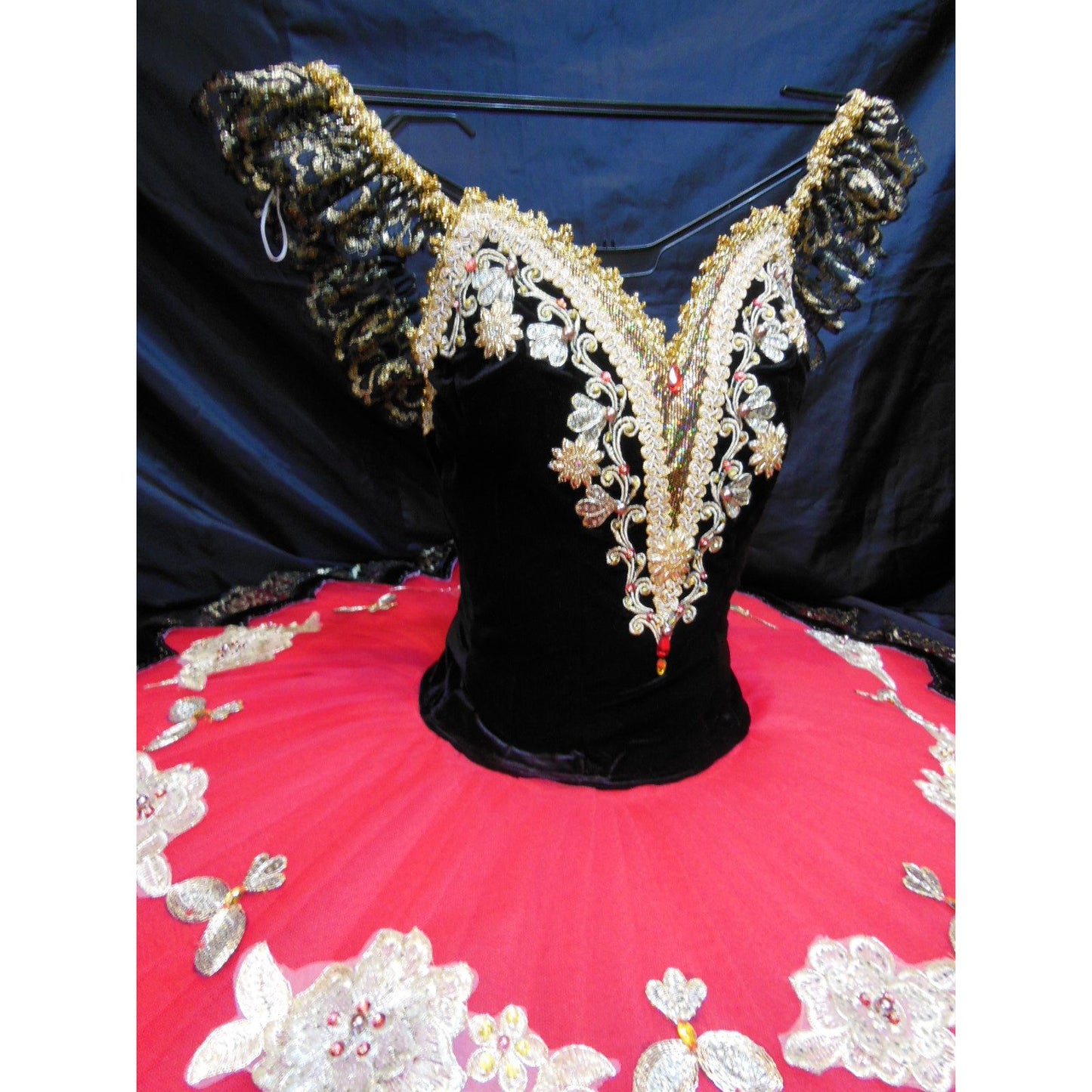 The ten layers, slightly bell shaped tutu skirt is red and lavishly embellished with black trims, golden flowers, beads and gold lace. All the layers of tulle are tacked together so that the costume moves as one with the dancer.
