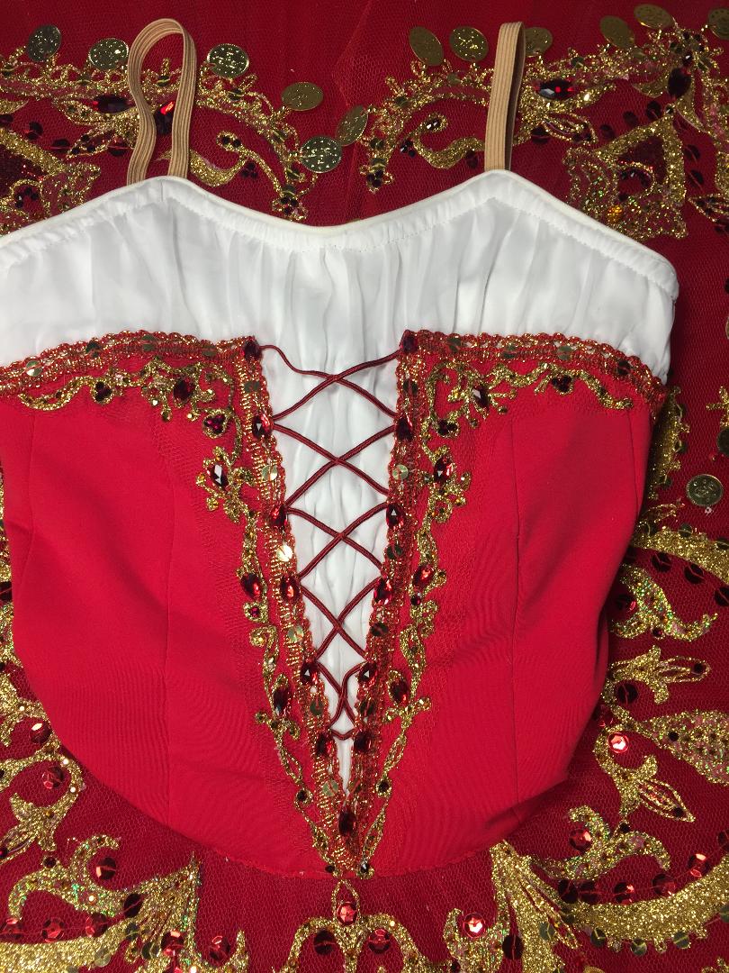 The professional pancake tutu skirt is red, with golden appliques, trims, red crystals and gold coins as decoration.