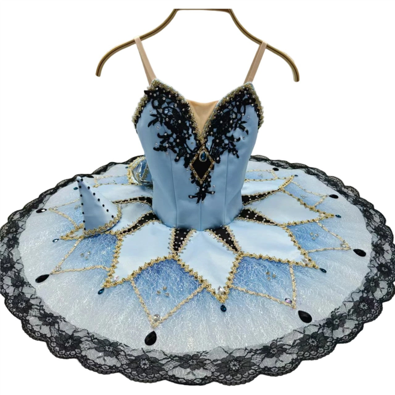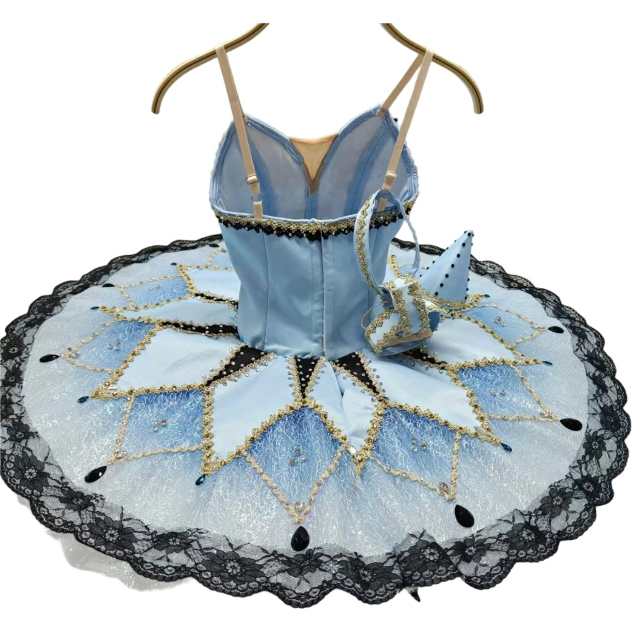 The pale blue, ombre' dyed professional 12 layers skirt is features a pale blue satin, flower-shaped tutu skirt, as well as black inserts and golden trims. The top layer of the tutu skirt is made with glittery tulle.