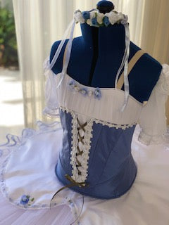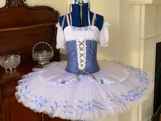 Traditional style peasant, Romantic tutu, created for roles like Swanilda or La Fille Mal Gardee. Bodice in beautiful sky blue brocade, with white chemise and crossed pattern. White three-quarter sleeves. The bodice is fully lined and beautifully decorated with flower appliques. The Romantic length, sky blue tutu skirt has been embellished in true peasant style of ribbons and laces. A white, embroidered apron completes the look of this gorgeous tutu.
