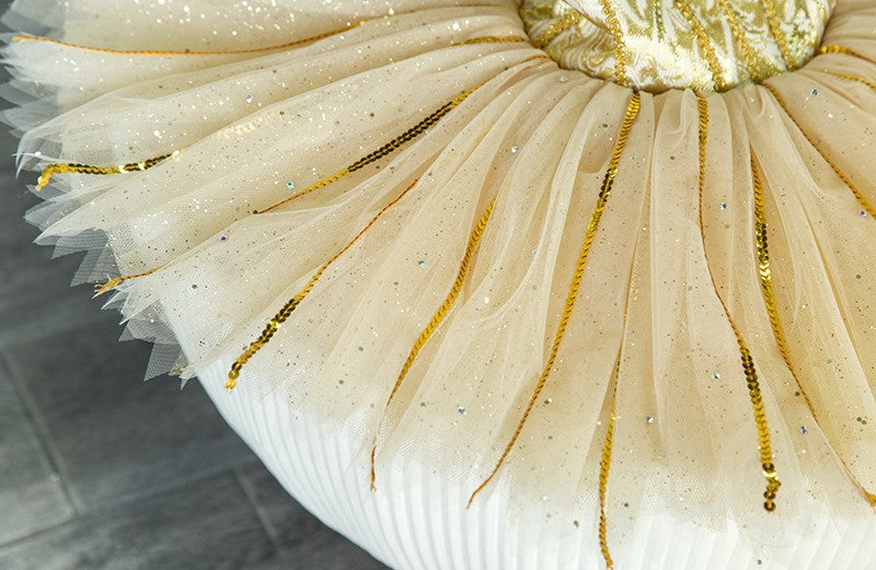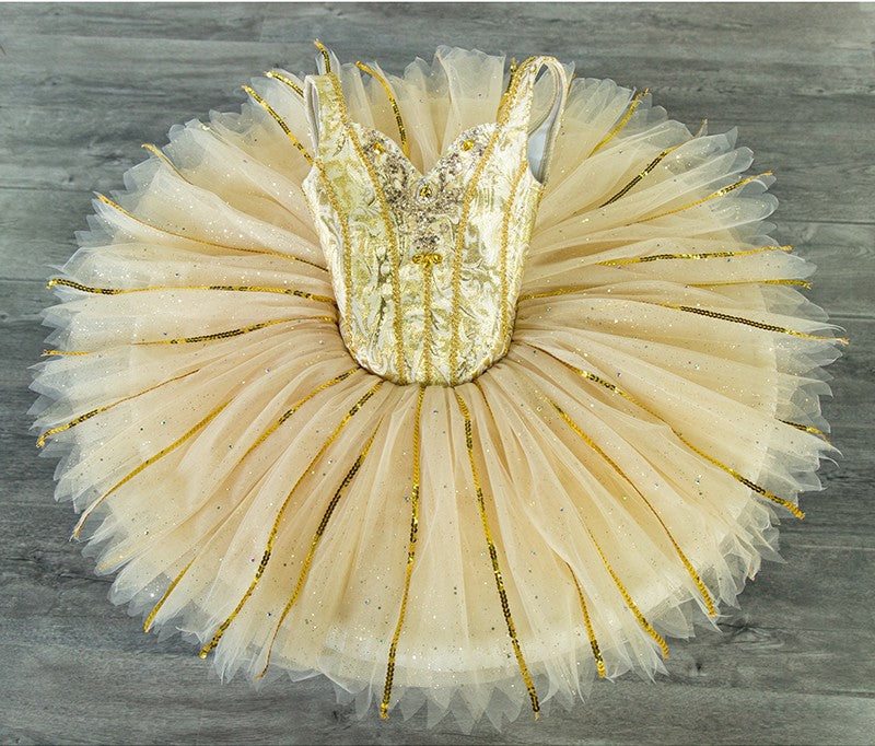 The professional tutu skirt is made using a soft shade of pale gold; there is a gold overlay, embroidered in gold.