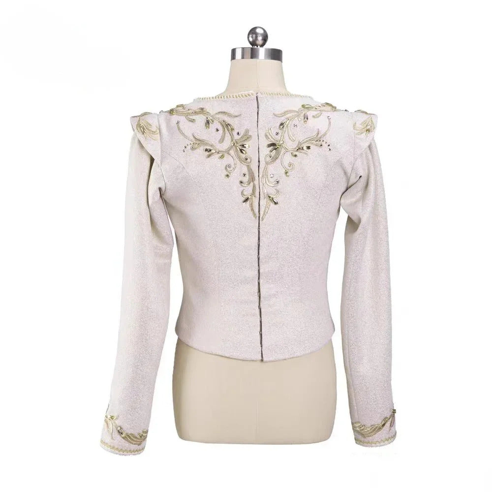 Made with ivory brocade, this professional stage costume features a white V insert and rich decoration with gold appliques, trims and crystals. Long sleeves embellished with gold appliques and sparkles.