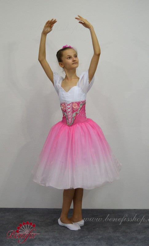 Das Oberteil besteht aus halbelastischem, dichtem Stoff. Der obere Teil ist mit Chiffon besetzt. Die Ärmel sind aus Chiffon. Am Oberteil befinden sich zwei Reihen Haken. Der Rock ist auf der Grundlage von T 0003 gefertigt und die obere Schicht besteht aus Chiffon mit rosa Farbverlauf.