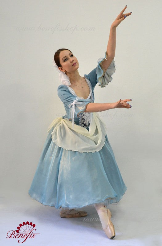 Zwei Hakenreihen auf der Rückseite des Mieders. Verzierung: Spitze, Borten und Satinbänder. Der romantische Tutu-Rock besteht aus sechs Lagen weichem und hartem Tüll, in verschiedenen Längen. Tüllhöschen. Das Höschen ist mit einem 7 cm breiten Tülljoch verbunden, das an einem elastischen Bund befestigt ist.