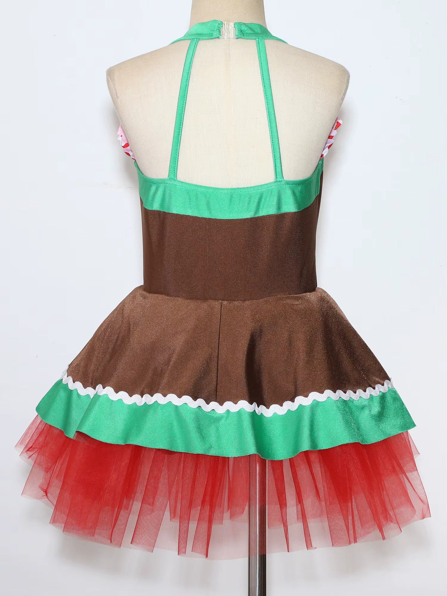 Brown dress with halter neck, decorations with green and red and white inserts, as well as white trims, buttons and red tulle.