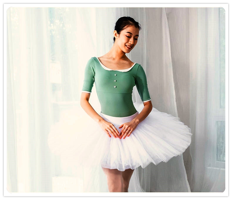 Dieser bezaubernde Turnanzug mit Dreiviertelärmeln hat vorne einen U-Boot-Ausschnitt und hinten einen tiefen, quadratischen Rücken. Schöne weiße Verzierungen vorne und hinten sowie an den Ärmeln. Drei süße weiße Knöpfe verzieren die Vorderseite des Turnanzugs.