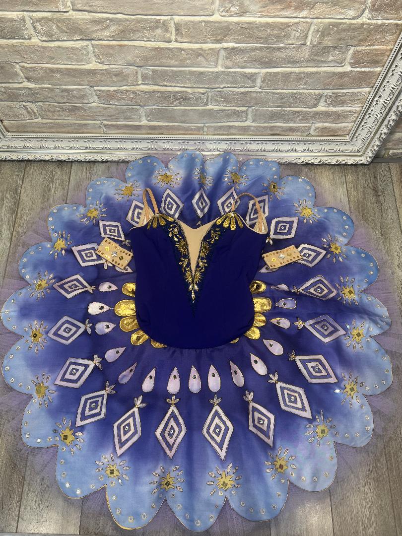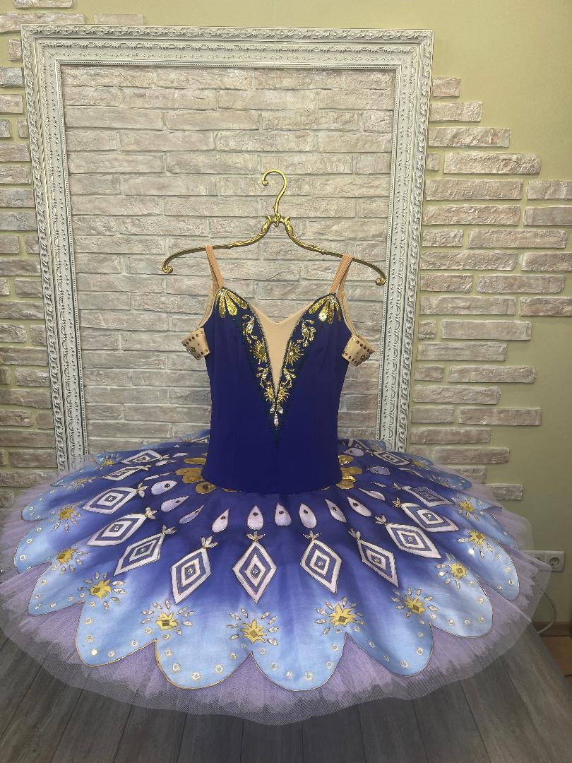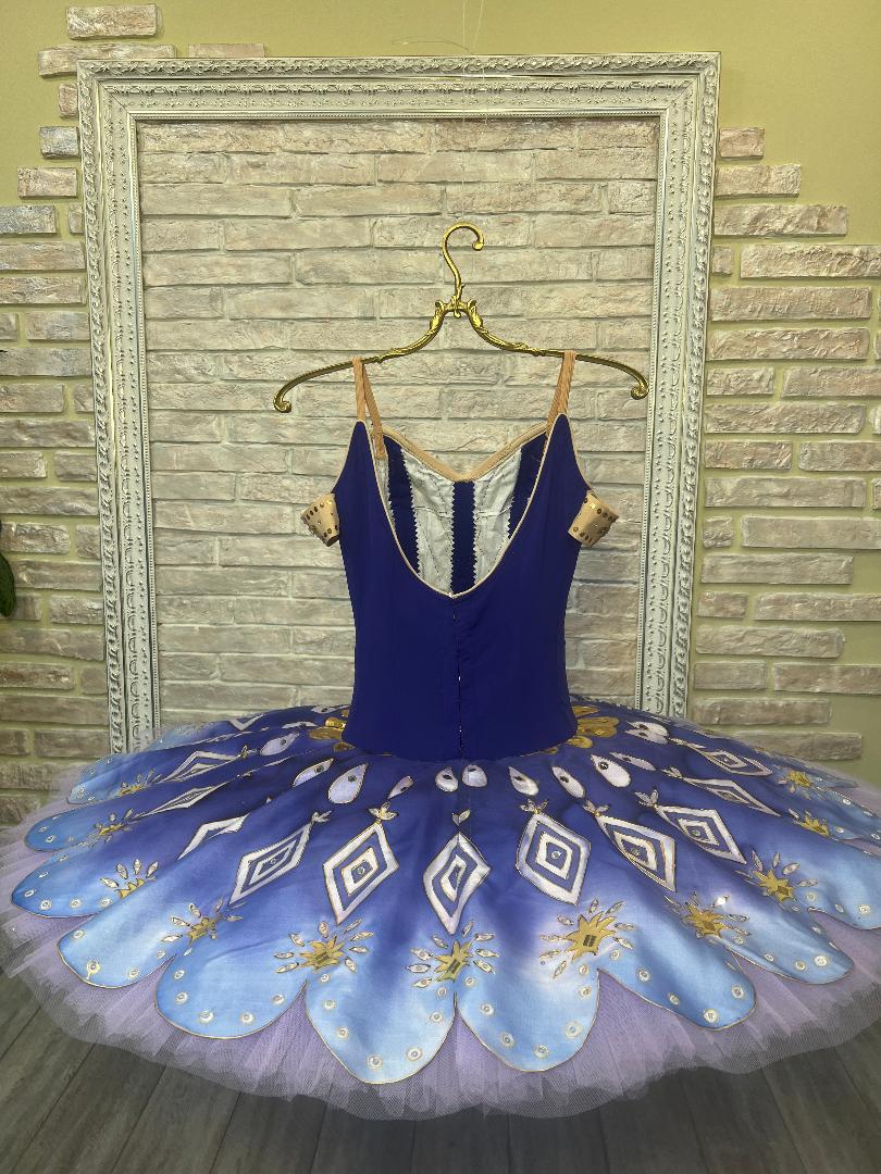 Der Teller-Tutu-Rock weist den gleichen tiefen Blauton auf und ist rundherum mit edlen Goldapplikationen und Kristallen von Hand aufgenäht.