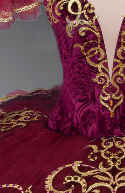 Dieses professionelle Tutu erinnert uns wirklich an den Herbst und fallende Blätter. Das Oberteil ist aus glänzendem kastanienbraunem Brokat gefertigt und mit Goldapplikationen und passenden Kristallen reich verziert. Der zehnlagige Tutu-Rock ist in der gleichen Farbe gefertigt und vollständig mit Gold bestickt.