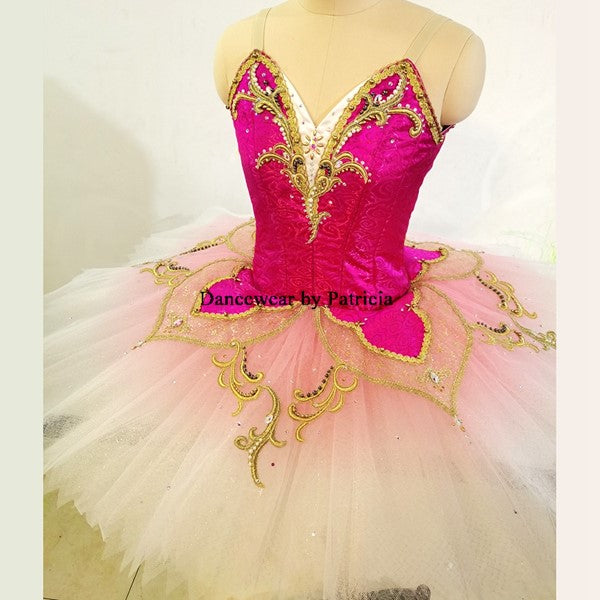 Das Tutu-Oberteil ist aus hochwertigem pinkfarbenem Brokat gefertigt. Es hat einen tiefen V-Ausschnitt vorne und einen weißen Satineinsatz. Die Verzierungen bestehen aus goldenen Applikationen und Borten sowie Kristallen und Perlen.