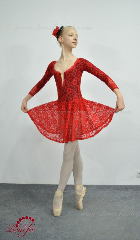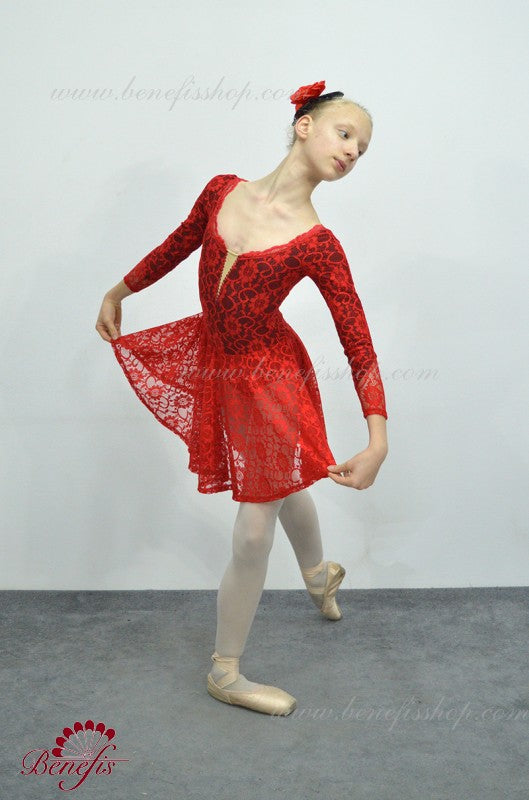 Hergestellt auf der Grundlage eines schwarzen Trikots und vollständig mit roter Spitze bedeckt. Mit tiefem V-Ausschnitt vorne mit hautfarbenem Einsatz, langen Spitzenärmeln und kurzem Spitzenrock.