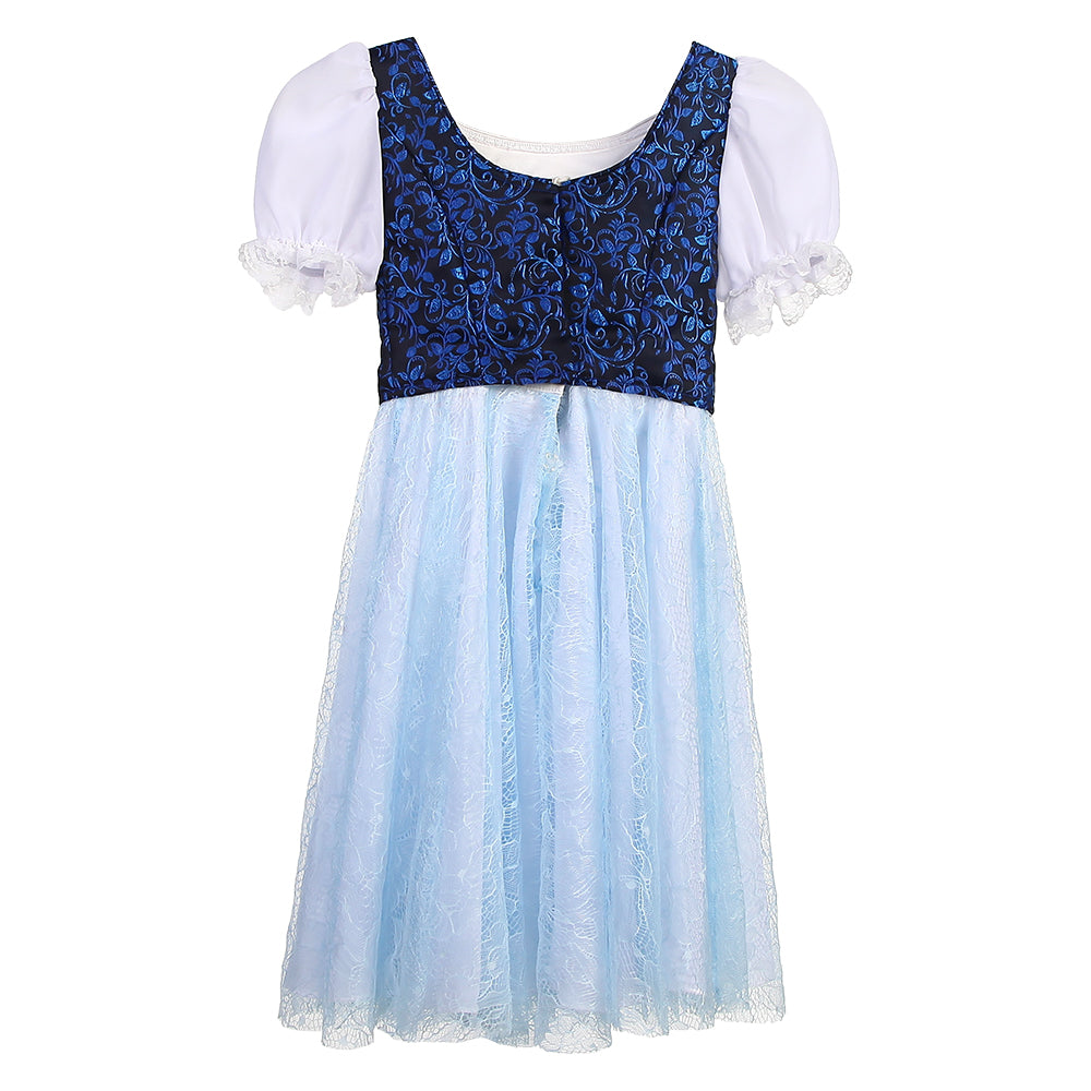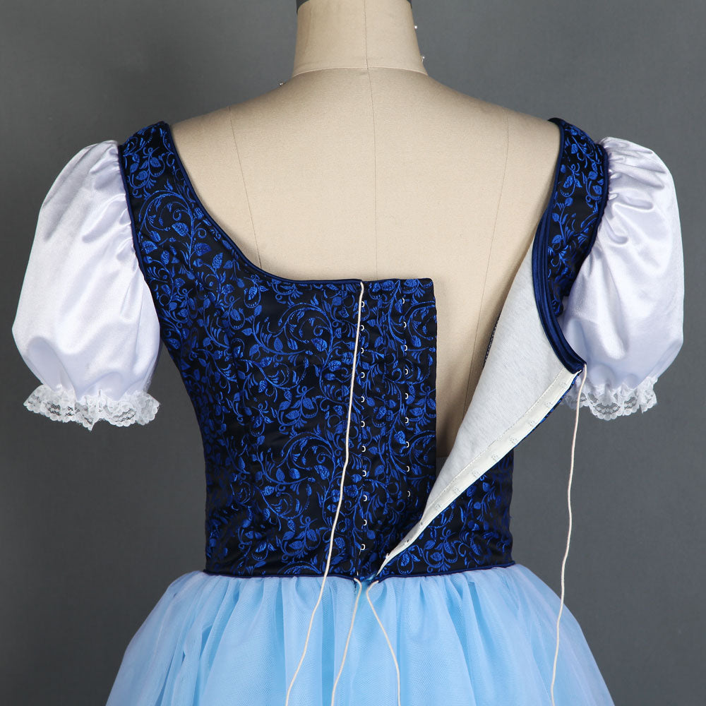 Blue and black brocade corset, with blue laced pattern and white undershirt. Short white sleeves and hooks and yes closure.