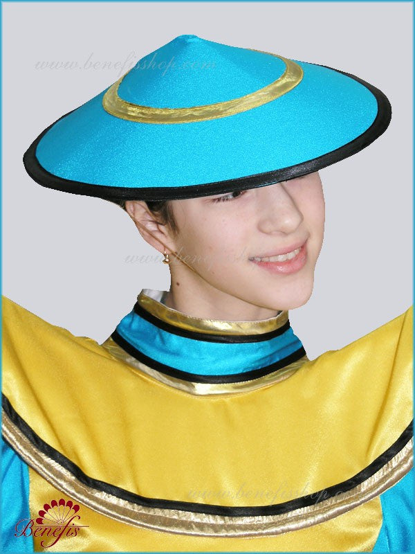 Das Kostüm ist im Stil alter chinesischer Traditionen mit einer charakteristischen kegelförmigen Kopfbedeckung gefertigt.