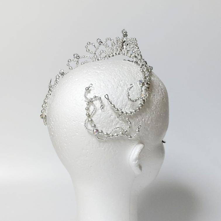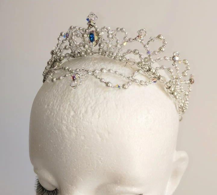Dieses von einem berühmten Designer für Ballettaccessoires handgefertigte Kopfstück im Kronenstil hat einen silbernen Rahmen und ist mit silbernen Perlen und klaren Swarovski-Kristallen verziert.