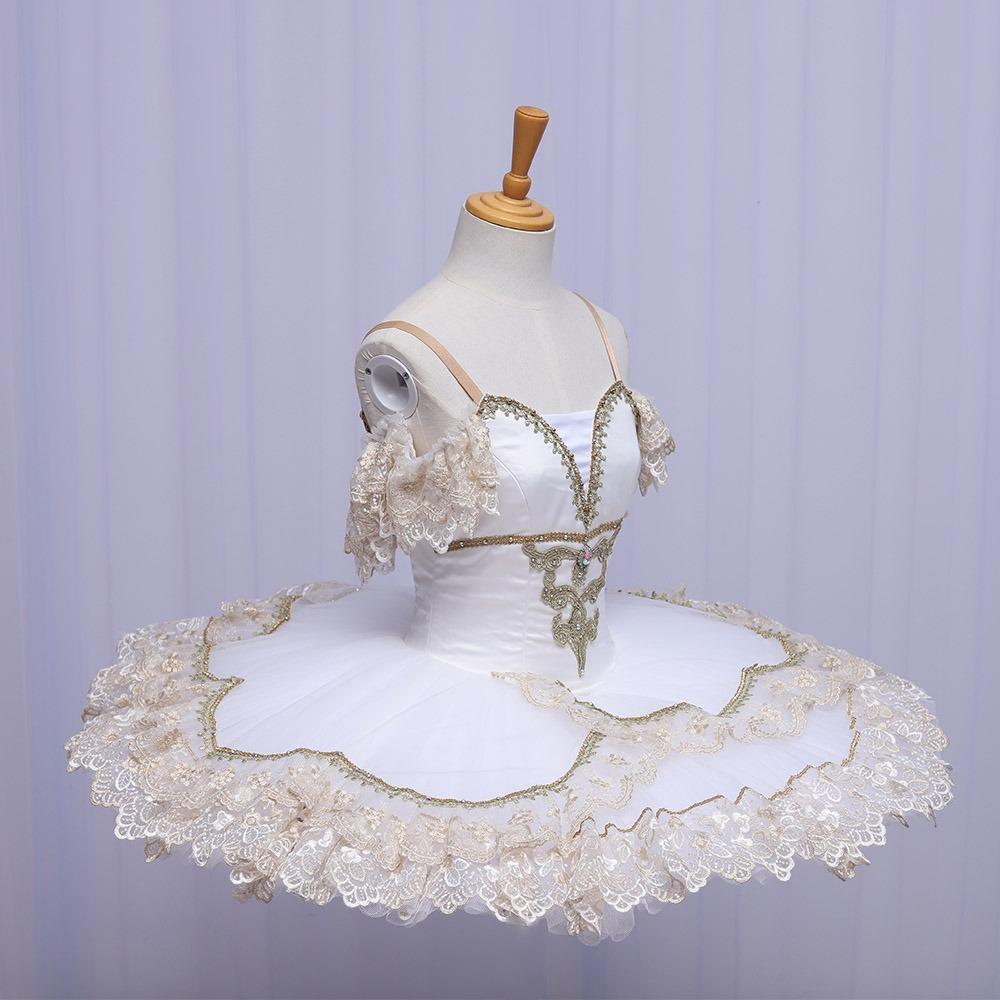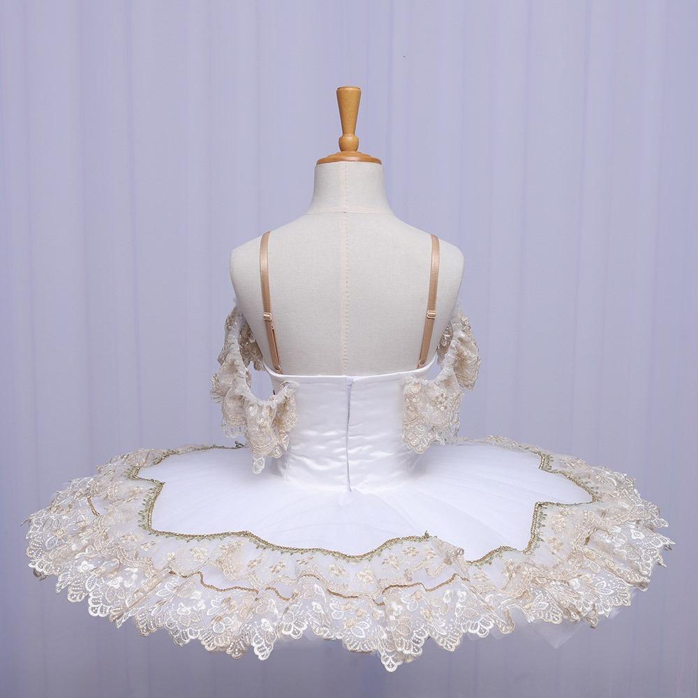 Der Pfannkuchen-Tutu-Rock ist reich mit verschiedenen Arten cremefarbener französischer Spitzen und goldenen Verzierungen verziert.
