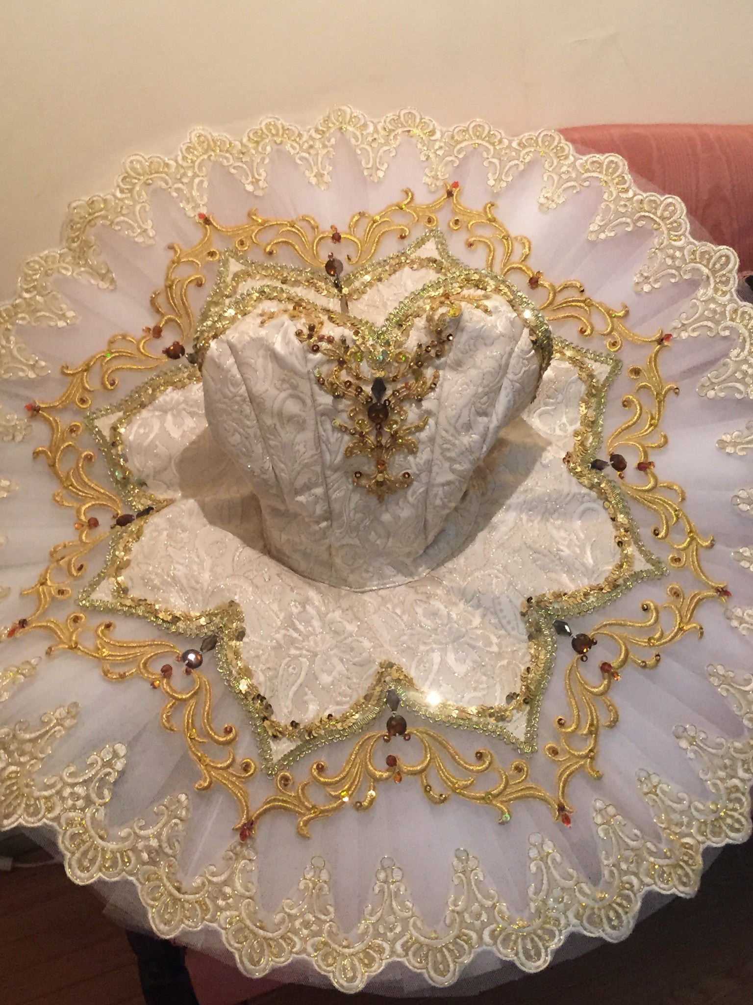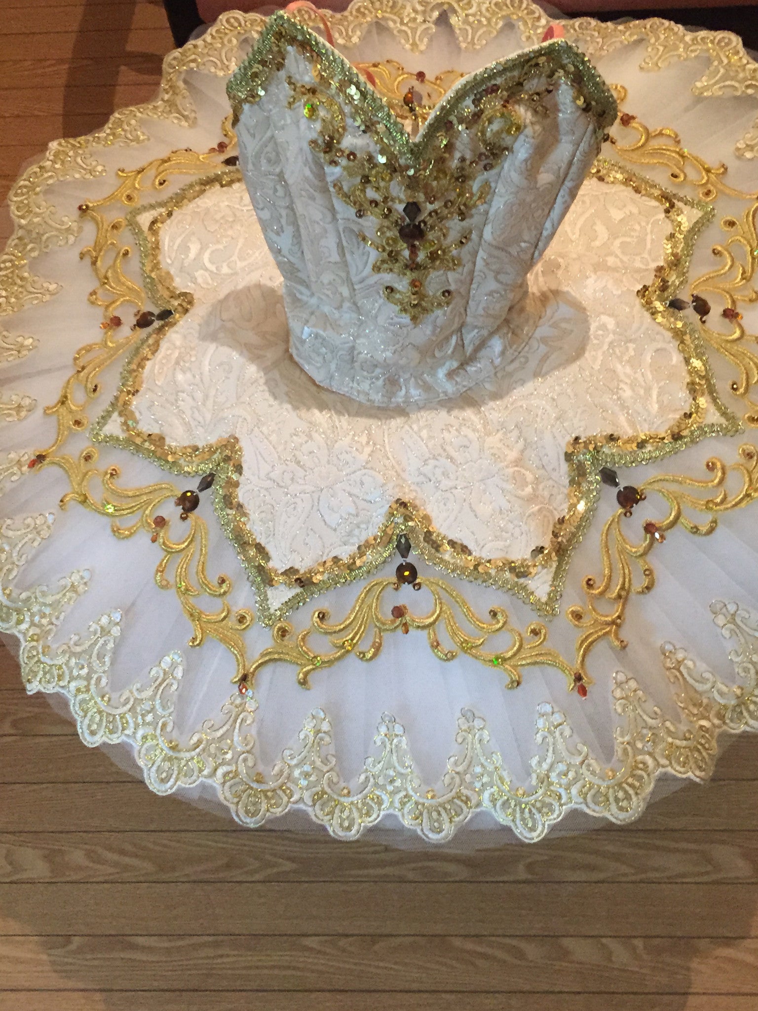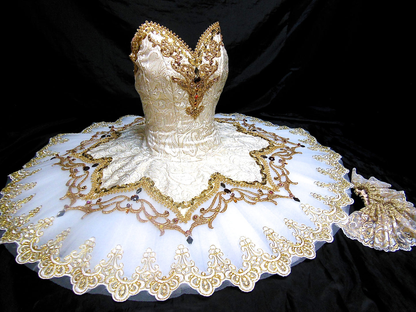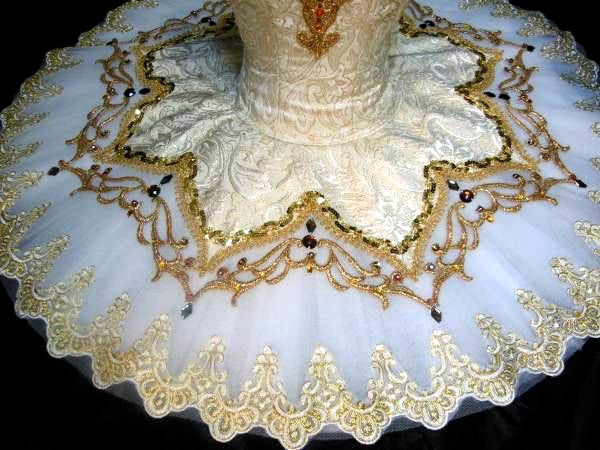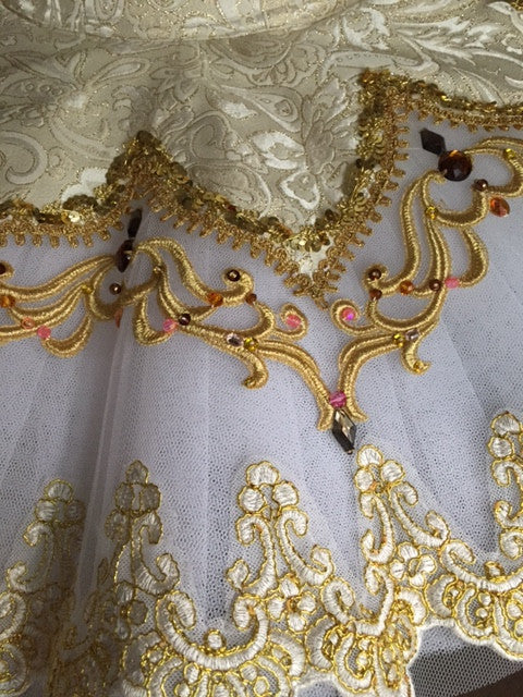 Der professionelle Tutu-Rock ist weiß und leicht glockenförmig. Er ist mit üppigen Goldverzierungen, Stickereien und Applikationen versehen. Armbänder inklusive.