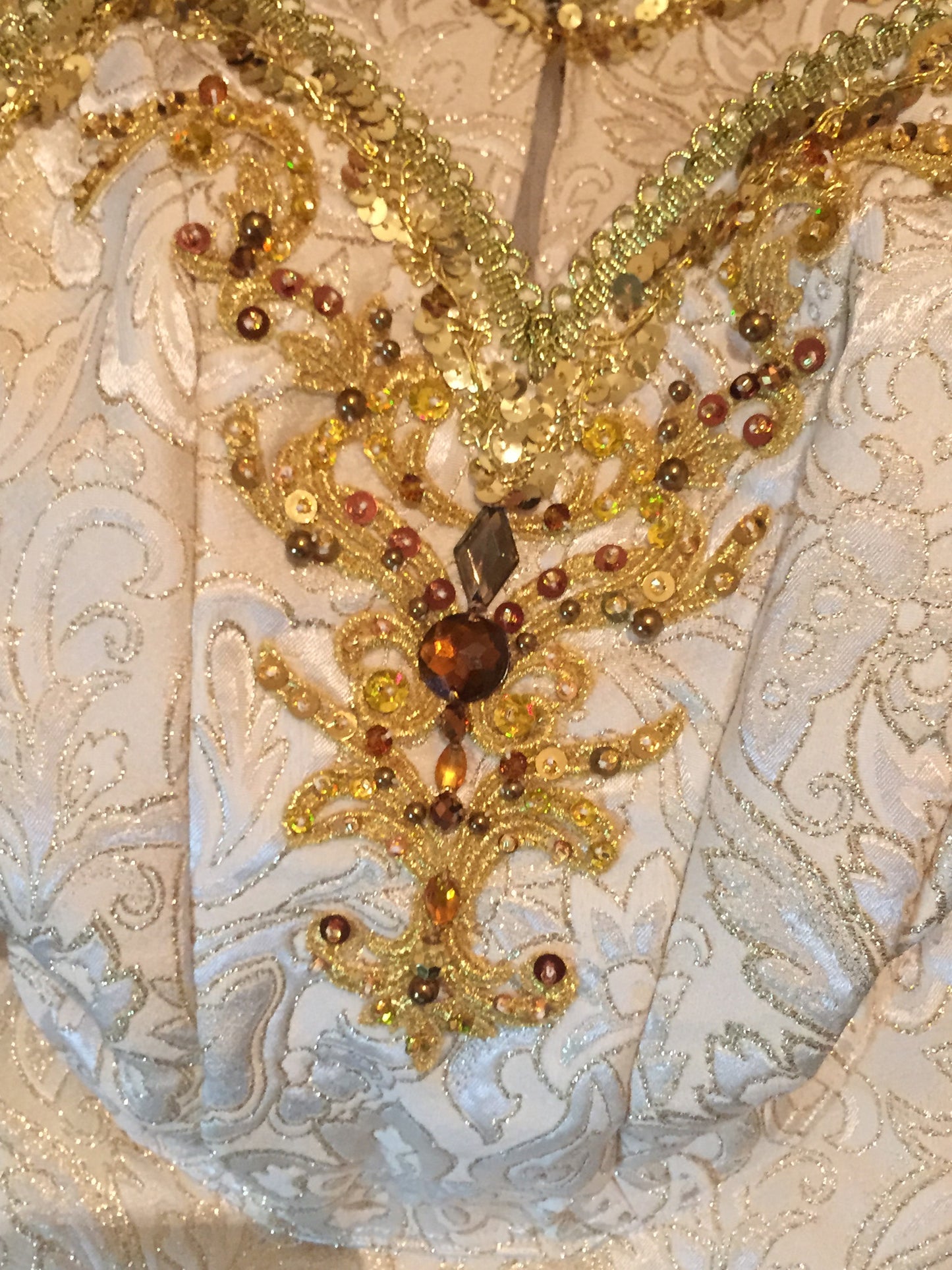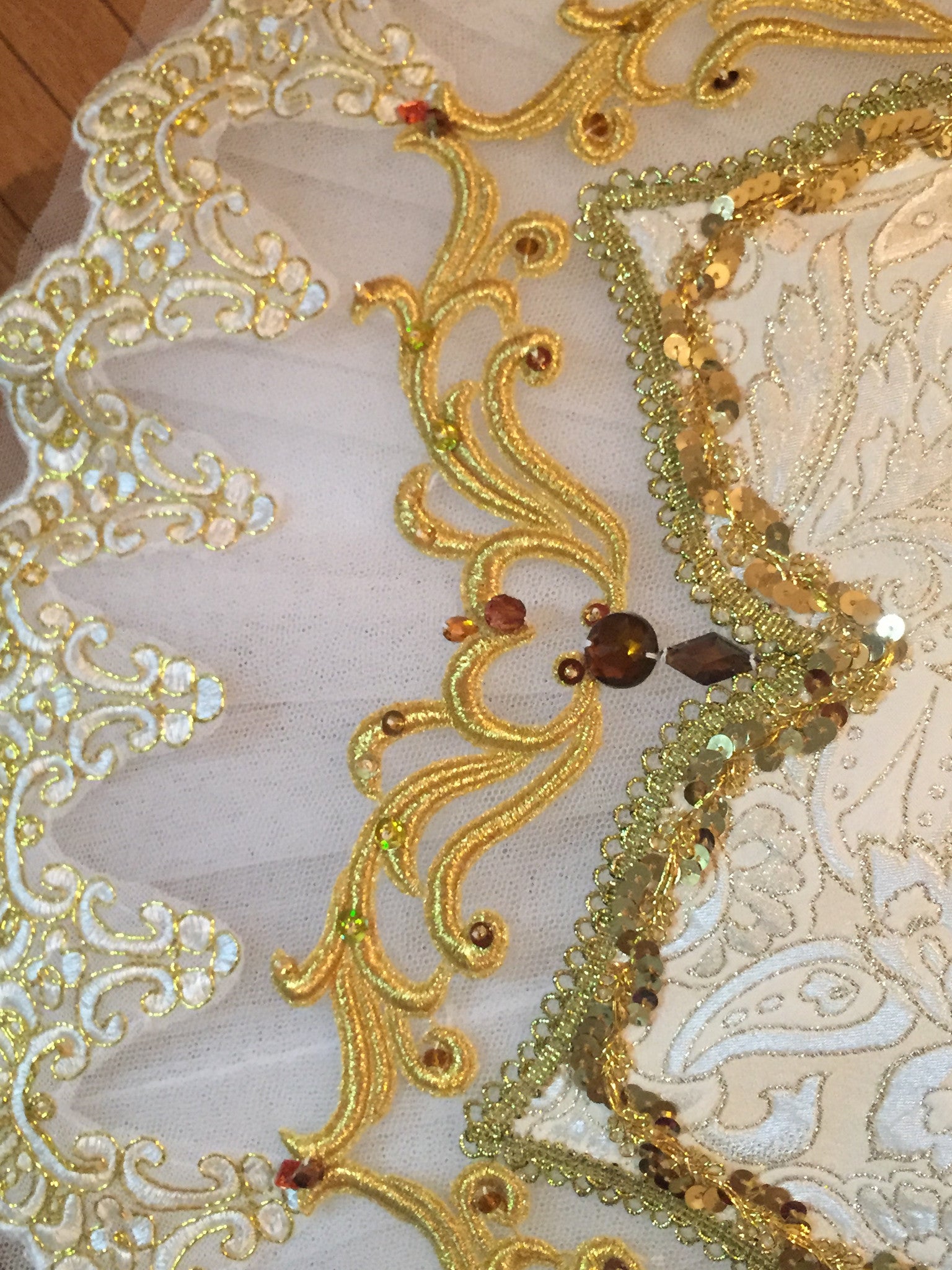 Die Überlage hat die Form einer Blume und ist aus dem gleichen Goldbrokat wie das Oberteil gefertigt. Sie ist außerdem mit Goldbesatz, Glitzer und Kristallen verziert.