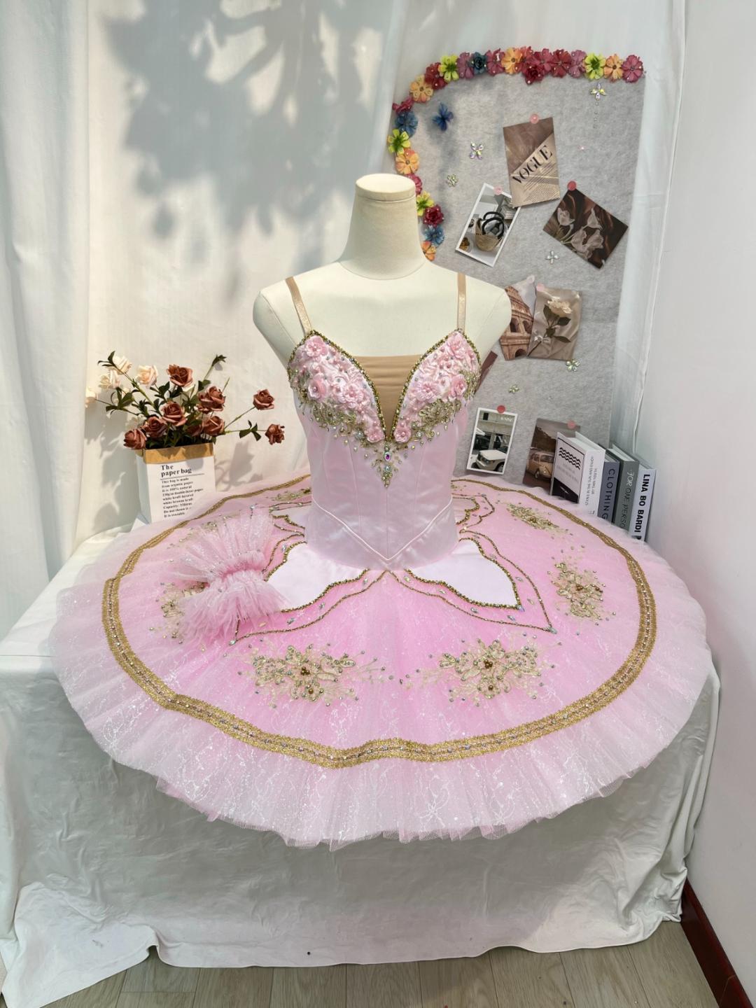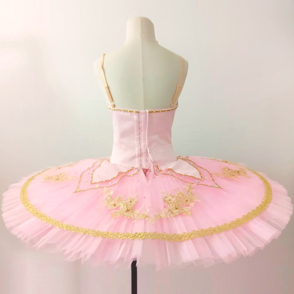 Der zehnlagige, professionelle Tutu-Rock ist ebenfalls blassrosa und rundherum mit blassrosa Applikationen, Kristallen und Pailletten bestickt.