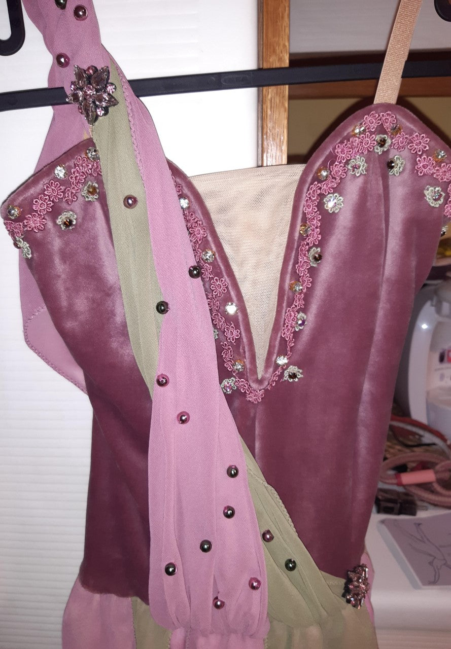 Das Oberteil des Kleides besteht aus rosa Pannesamt und hat einen tiefen V-Ausschnitt mit hautfarbenem Netz. Das Oberteil ist mit blumenförmigen rosa Pailletten und rosa Kristallen verziert.