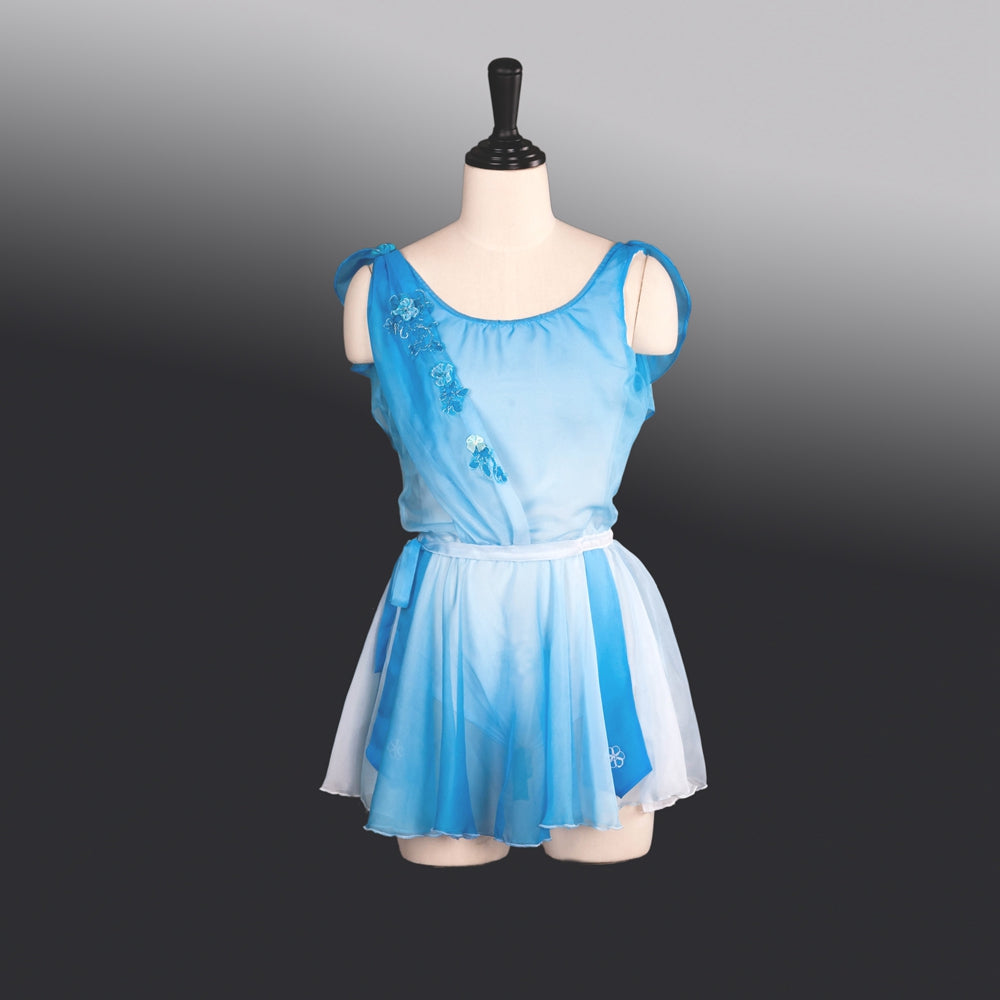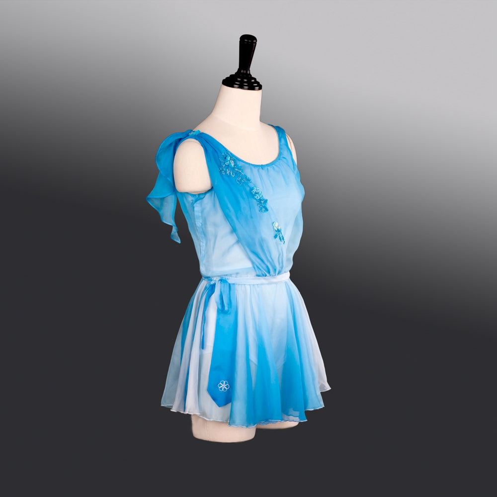 Rundhalsausschnitt vorne und hinten und ein wunderschöner integrierter Schal mit glänzenden Applikationen auf der rechten Schulter. Auf Taillenhöhe befindet sich ein kleiner Gürtel, der den Look dieses bezaubernden Bühnenkostüms vervollständigt.