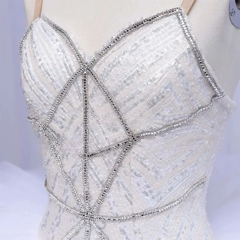 Das Oberteil ist vollständig in Silber bestickt und mit silbernen Verzierungen, Strasssteinen und Glitzer versehen.
