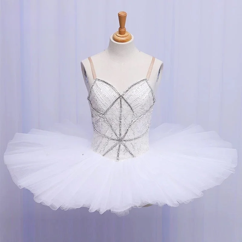 Professionelles weißes Teller-Tutu mit silbernen Verzierungen für die Rolle der Diamantfee in Dornröschen. Es kann auch für die Rolle der Schneekönigin oder des Schneeflöckchens verwendet werden.