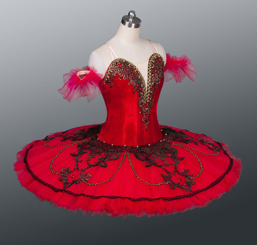 Der professionelle, zehnlagige Tutu-Rock ist mit reichhaltiger Verzierung und einem spanisch anmutenden Muster versehen. Gold- und Silberapplikationen, schwarze Spitze, Glitzer, Diamanten und Kristalle vervollständigen den Look dieses atemberaubenden Bühnenkostüms.