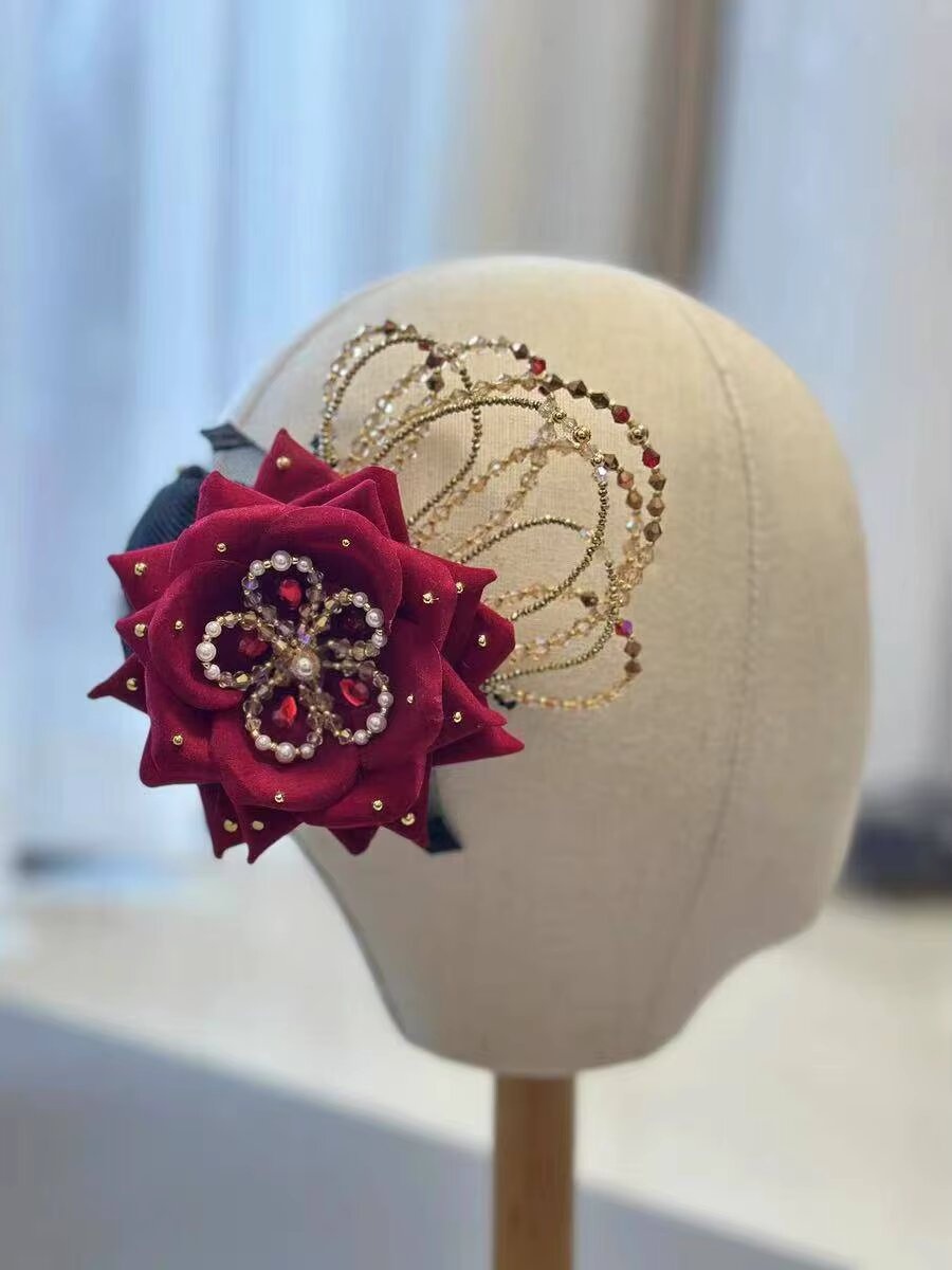 Dieser wundervolle professionelle Kopfschmuck für die Rolle der Kitri ist eine Kombination aus einer atemberaubenden roten Seidenrose und einem goldenen, mit Perlen verzierten Kamm.