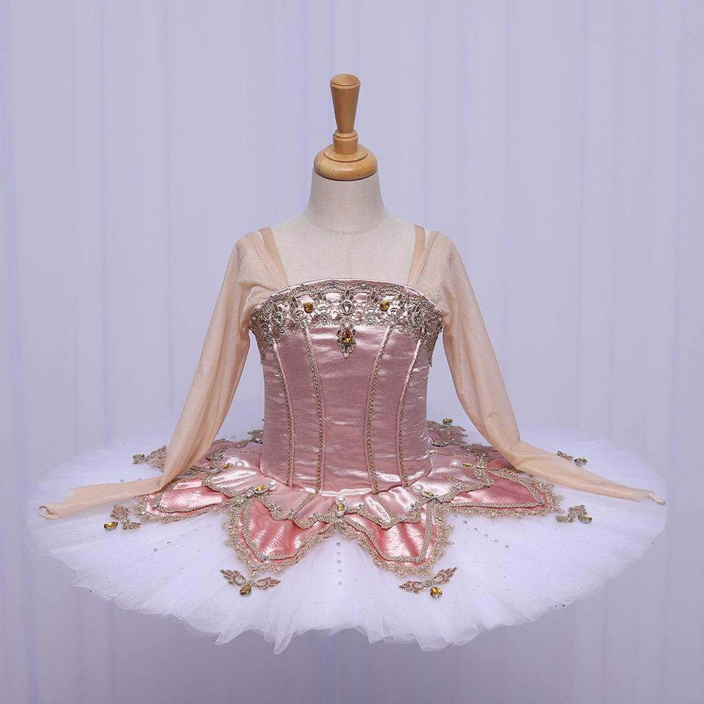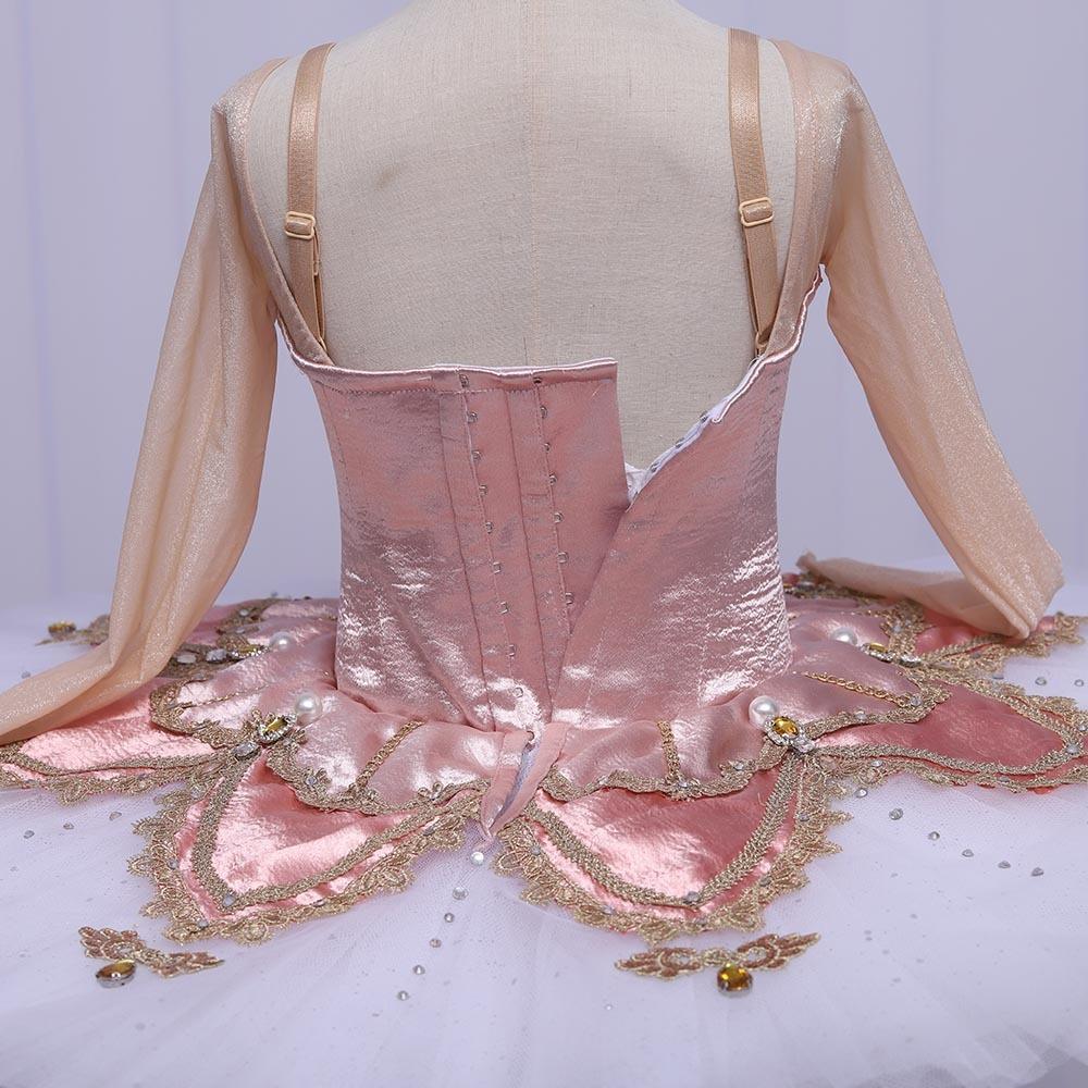 Der Miederstil ist sehr originell, mit einem abgerundeten Oberteil und langen Ärmeln aus nacktem Netzstoff, die an transparenten Trägern befestigt sind. Das Mieder besteht aus einem speziellen, halb dehnbaren, glänzenden Stoff in einem staubigen Rosaton. Der obere Teil des Tutu-Mieders ist reich mit goldenen Applikationen und Kristallen verziert und in der Mitte der Brust befindet sich ein zentraler Edelstein.