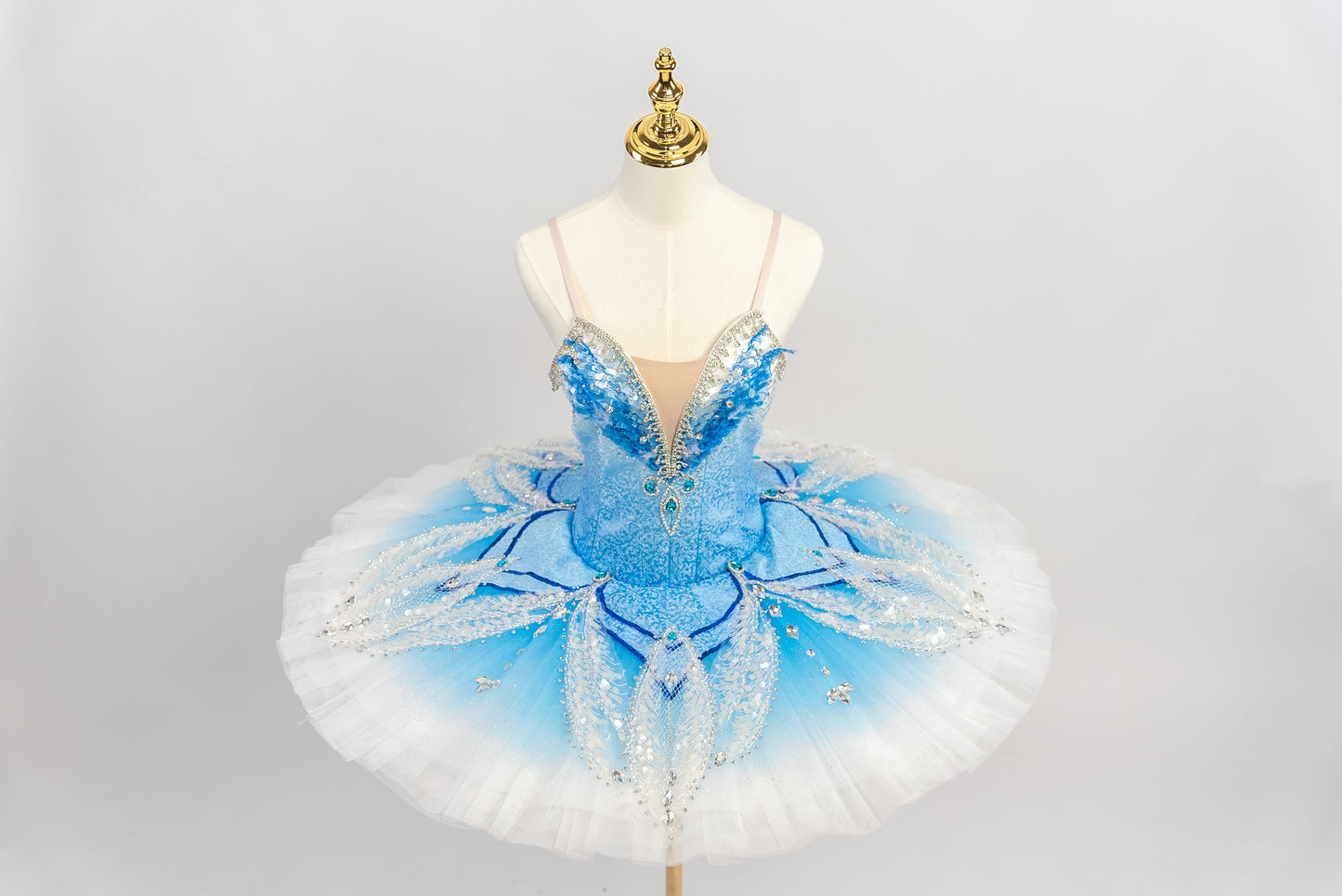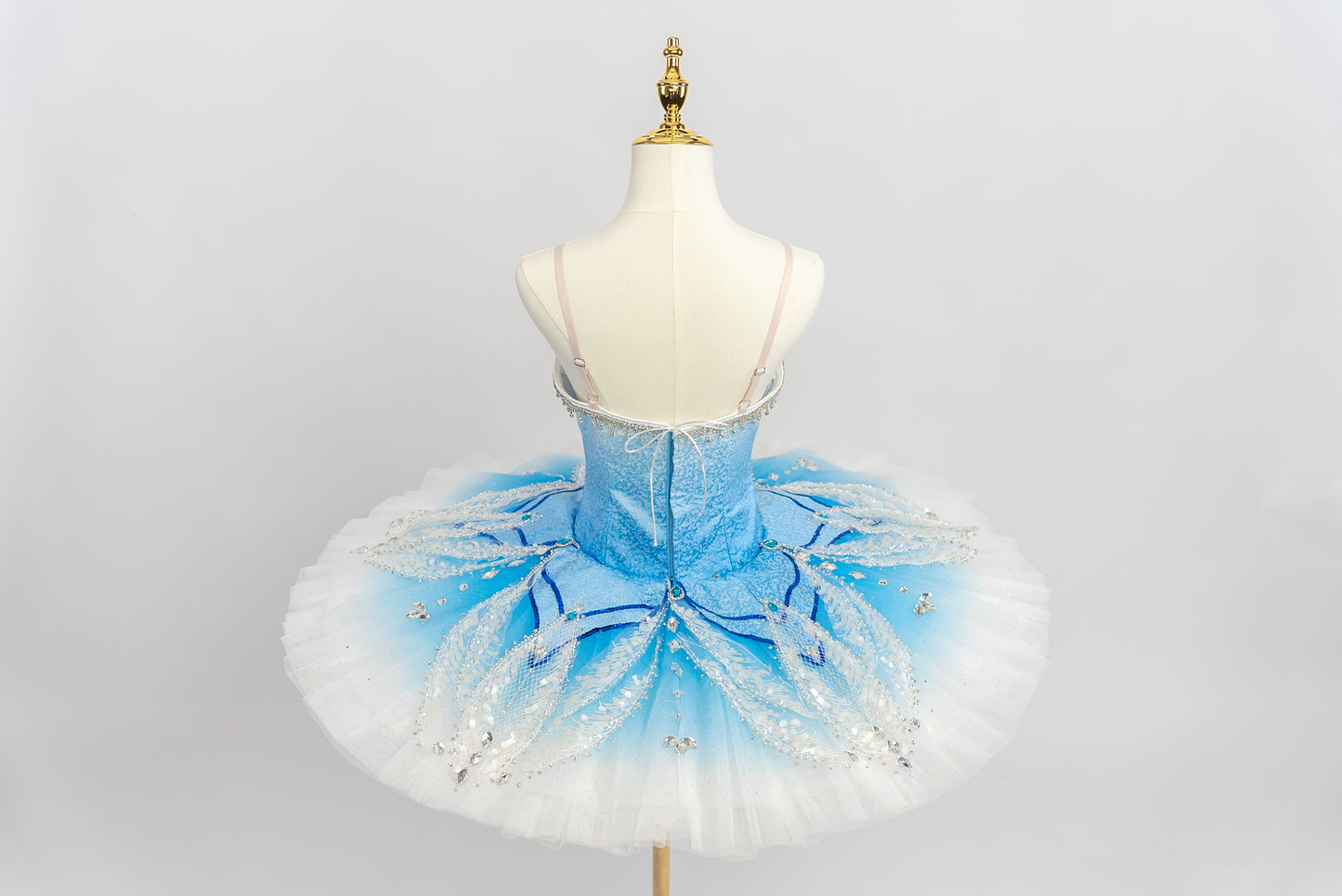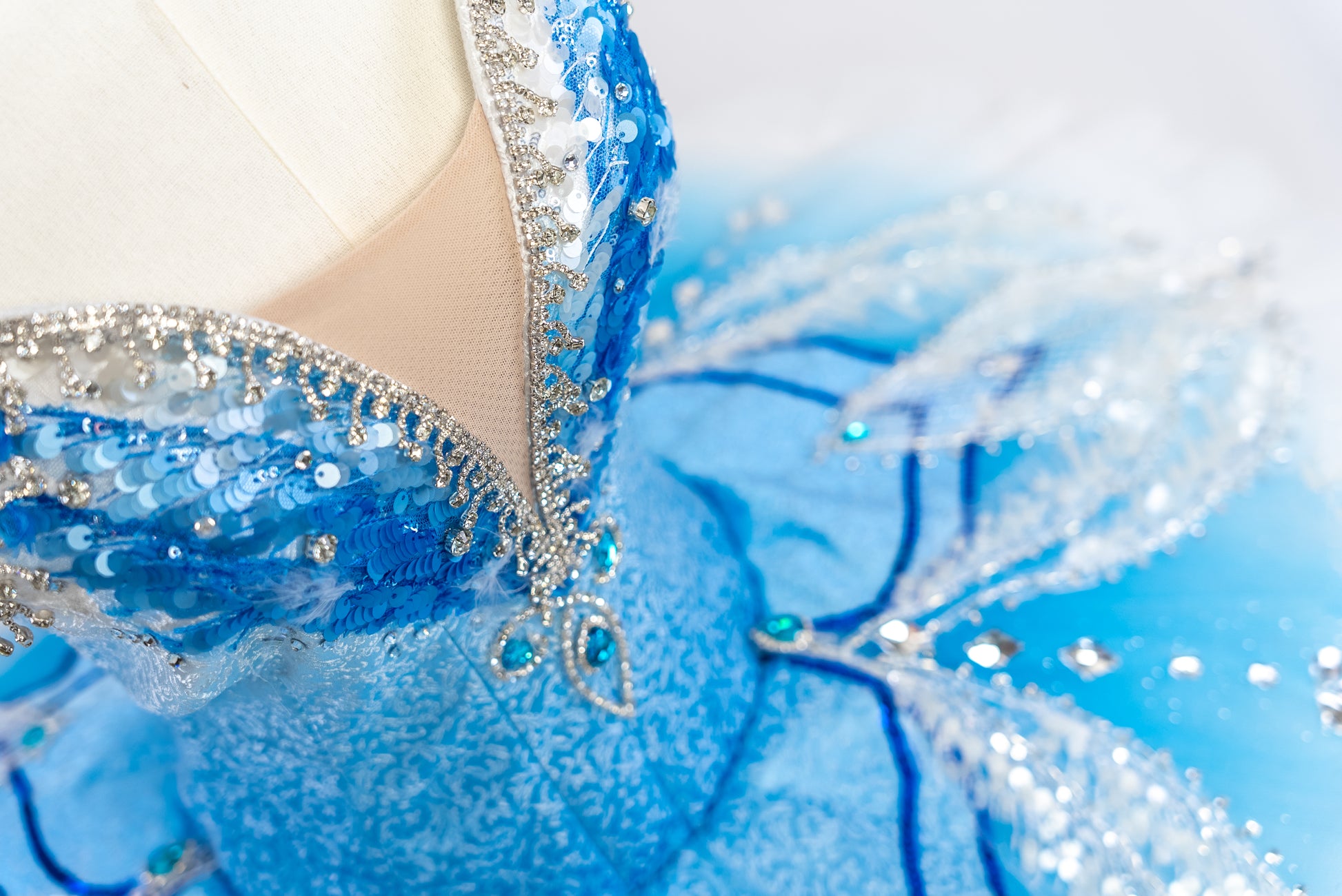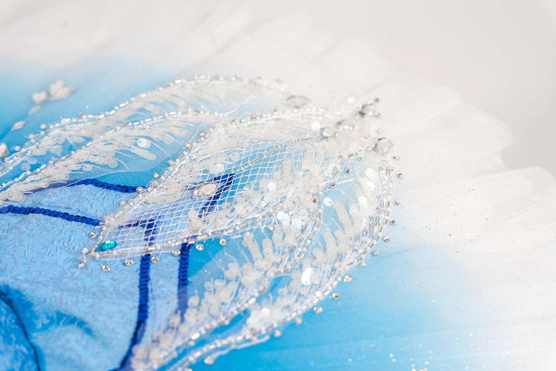 Das glänzende Oberteil ist himmelblau mit blauen Applikationen, Kristall- und Paillettenverzierungen, Strasssteinen und silbernen Verzierungen. Das Oberteil wird hinten mit einer doppelten Reihe Haken und Ösen geschlossen. Der professionelle Teller-Tutu-Rock ist im Ombre-Stil gefärbt und weist Farbverläufe von Blau zu Weiß auf. Die äußerst üppige Verzierung auf dem Tutu-Rock macht dieses Tutu sehr glänzend und eindrucksvoll.