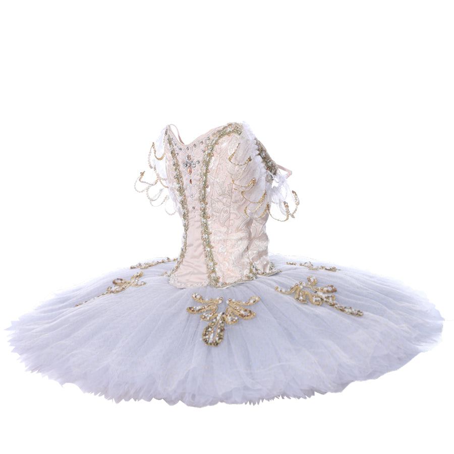 Ein königliches Tutu für jede Prinzessinnenrolle. Das Mieder, das hinten mit einer doppelten Reihe Haken und Ösen befestigt wird, besteht aus einem sehr blassen rosa Brokatton und ist reich mit Gold verziert. Die Flügelärmel sind aus weißem Tüll und mit Gold verziert. Der professionelle Tutu-Rock besteht aus zehn Lagen feinstem weißen Netz und ist mit reichen Goldapplikationen verziert.