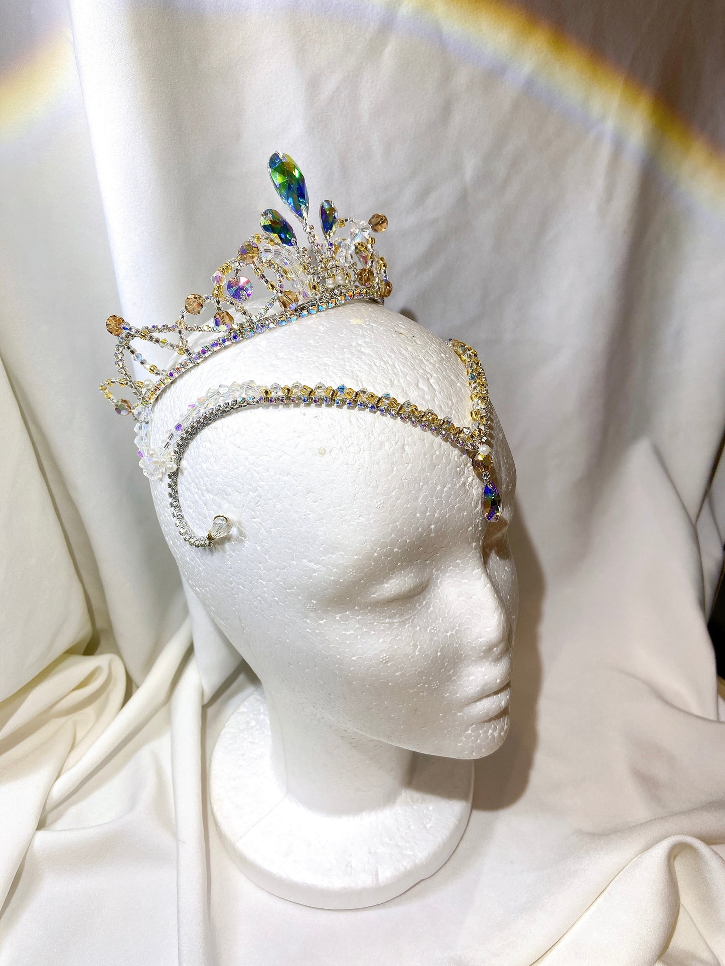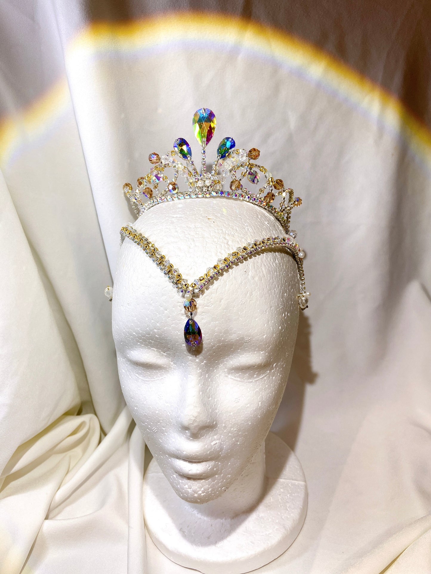 Diese atemberaubende Tiara im orientalischen Stil wurde aus über 100 Swarovski Aurora-Kristallen gefertigt. Sie glänzt blendend und wertet jedes Ballett-Tutu auf.
