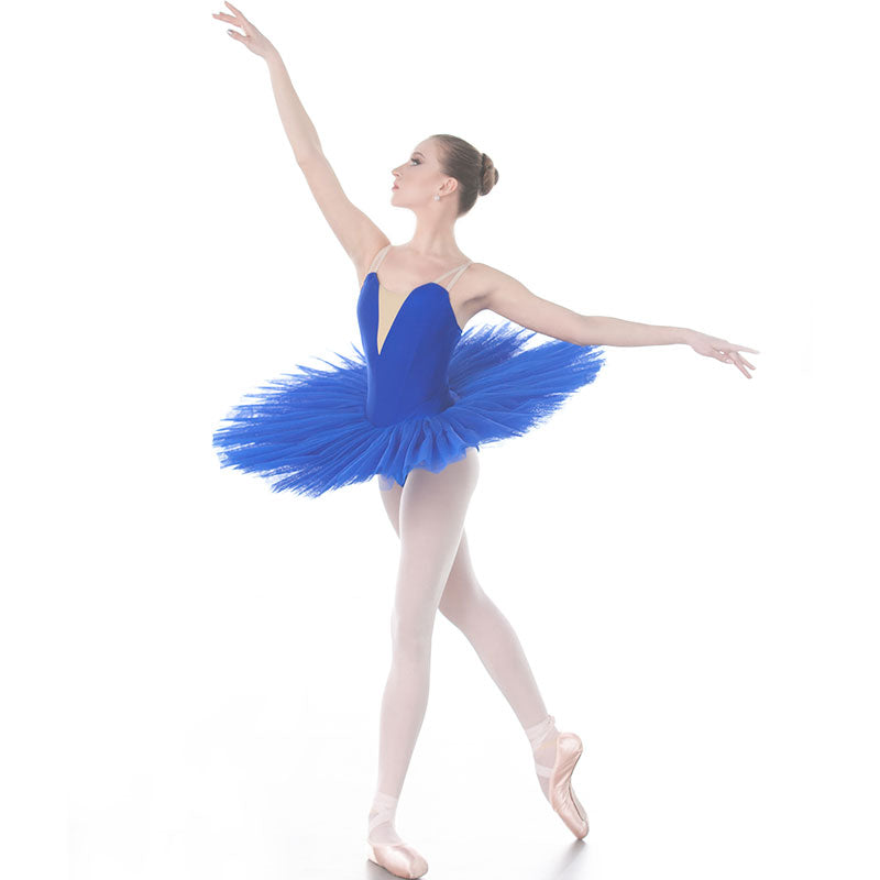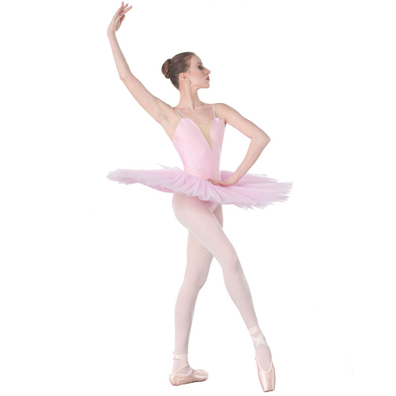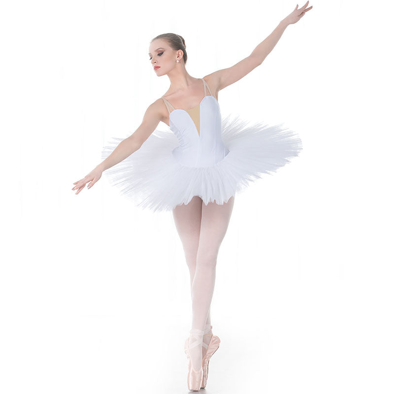 Das Tutu wurde nach dem Vorbild eines vollprofessionellen Tutus gefertigt. Das Oberteil ist aus hochwertigem Lycra gefertigt und verfügt über einen hautfarbenen V-Einsatz auf der Vorderseite und transparente elastische Träger.
