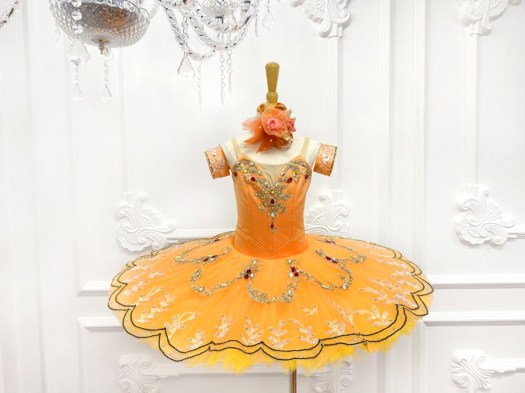 Das Oberteil ist aus halb dehnbarem, orangefarbenem Satin gefertigt. Es hat vorne einen tiefen V-Ausschnitt und einen hautfarbenen Einsatz. Die Vorderseite des Oberteils ist vollständig mit goldenen Applikationen, Borten und orangefarbenen Kristallen verziert. Armbänder in Form von Armbändern sind im Lieferumfang enthalten. Der leicht glockenförmige Tutu-Rock ist aus einem blasseren orangefarbenen Tüllton gefertigt. Die erste Schicht ist buchstäblich mit goldenen Blütenblatt-Applikationen, Pailletten und Kristallen bedeckt.