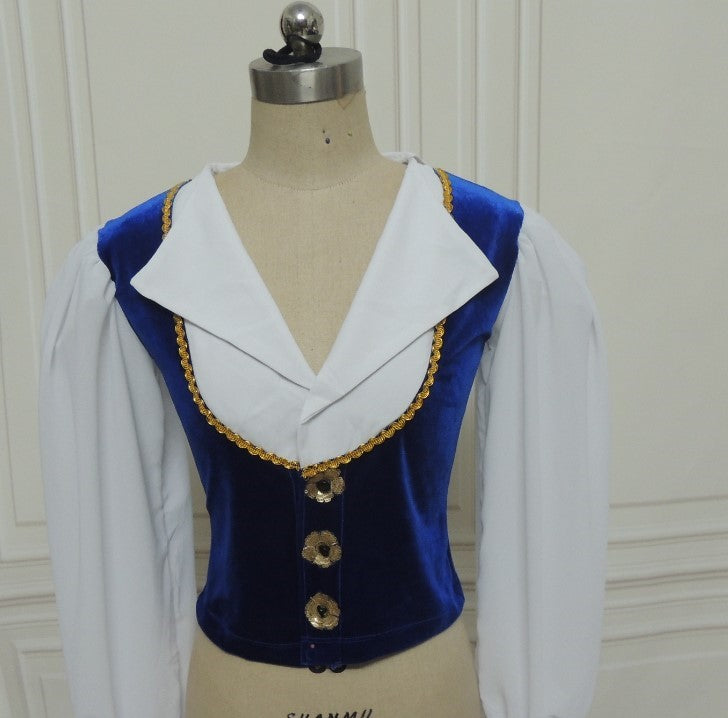 Dieses Ballettoberteil besteht aus einer dunkelblauen Samtweste und einem weißen Unterhemd mit langen Ärmeln.