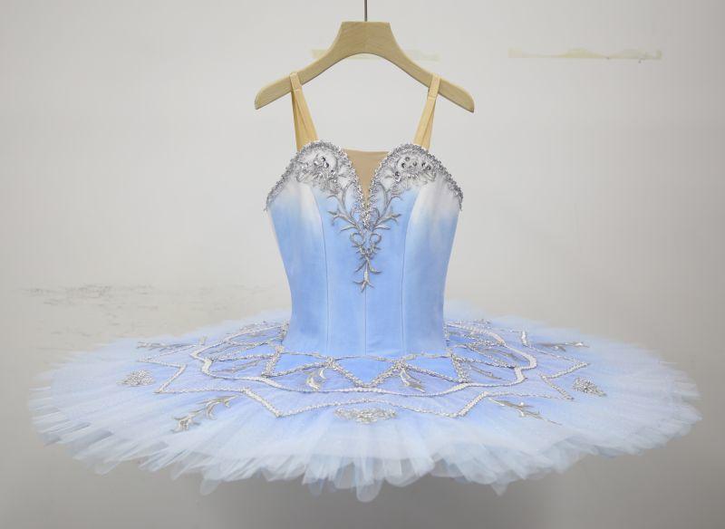 Der zehnlagige Pfannkuchen-Tuturock ist ebenfalls in hellblauen Tönen handgefärbt und weist eine sehr reiche Verzierung mit silbernen Applikationen und Verzierungen auf.