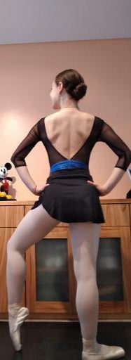 Es verfügt über einen V-Ausschnitt mit Raffung auf der Vorderseite, lange Ärmel aus schwarzem Netzstoff und einen V-förmigen Netzstoff auf der Rückseite mit Raffung auf der Rückseite.