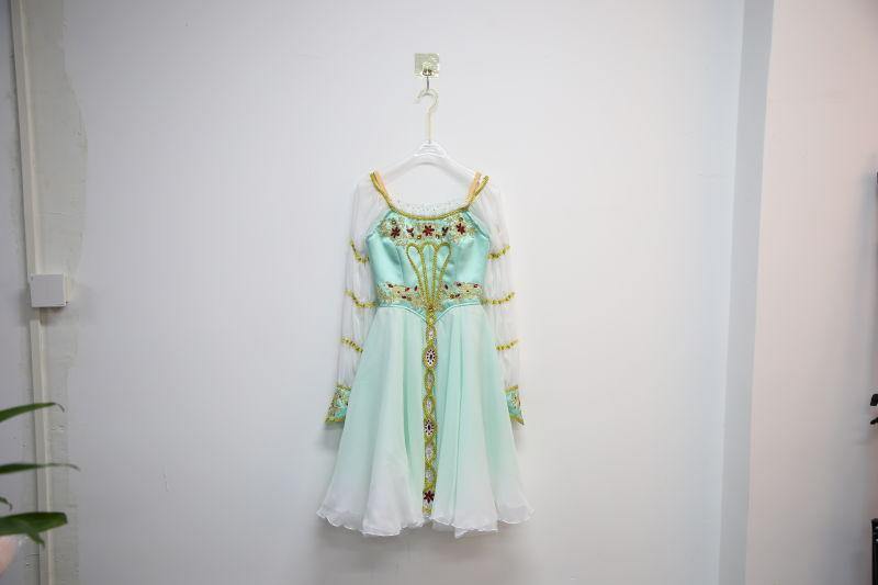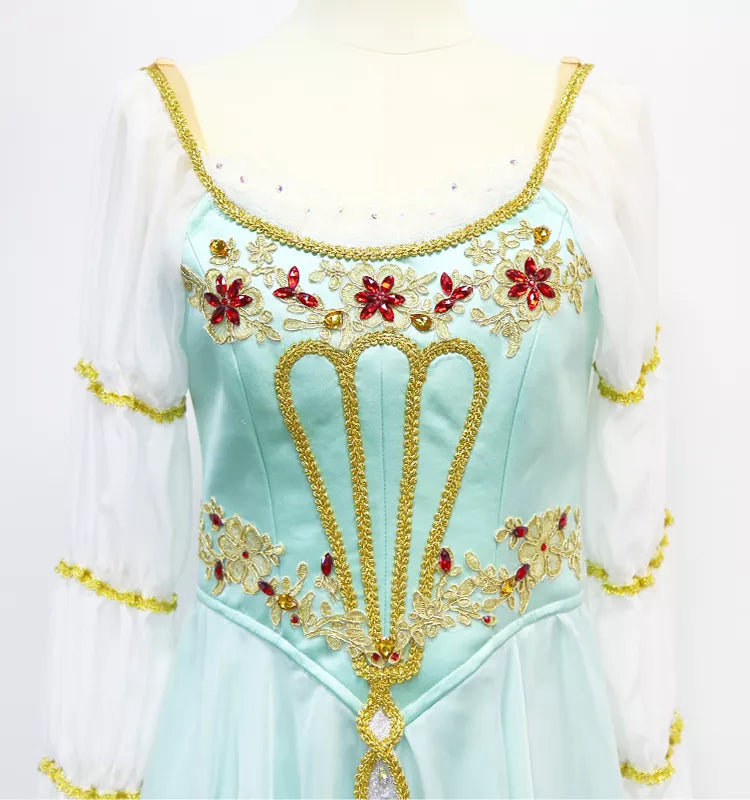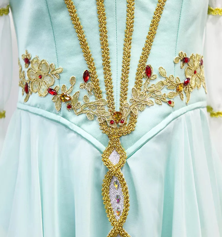 Der knielange Chiffonrock ist im Ombre-Stil gefärbt und verfügt über eine wunderschöne, lange, gürtelartige Goldverzierung, die typisch für das Pas de Trois-Kostüm ist.