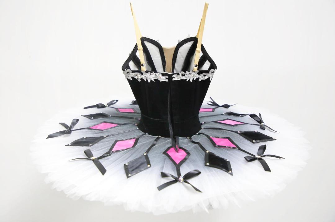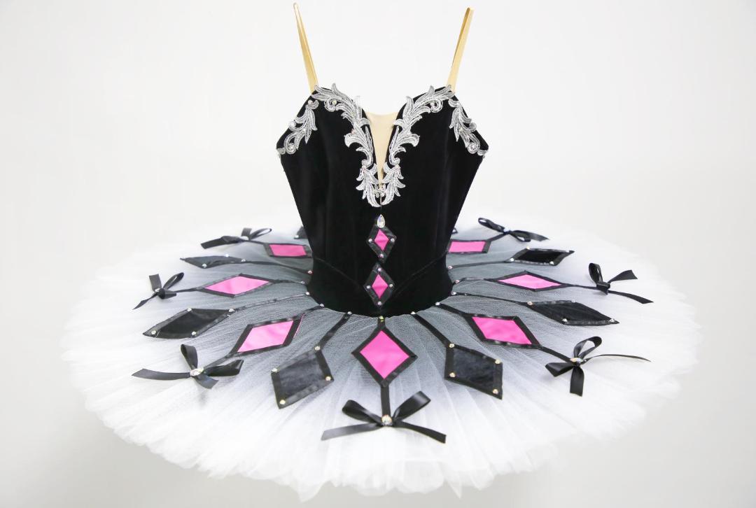 Der professionelle, zehnlagige Tutu-Rock ist weiß, mit grauen Ombre-Tönen im oberen Teil. Der Rock weist außerdem ein typisches Harlekin-ähnliches Motiv mit leuchtend rosa und schwarzen geometrischen Applikationen auf. Die Ränder des Tutus sind mit schwarzen Schleifen und Glitzer verziert.