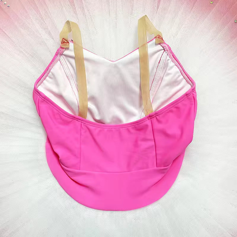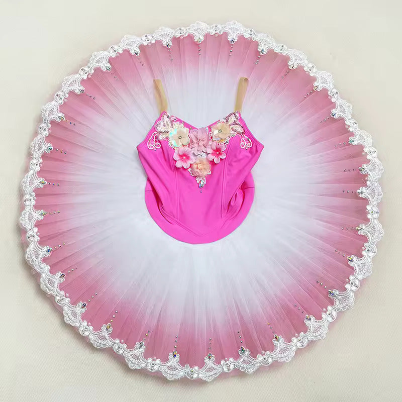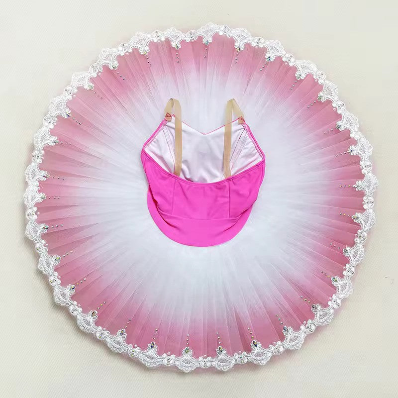 Der im Ombre-Farbton gefärbte Pfannkuchen-Tutu-Rock weist zu den Rändern hin abgestufte Rosatöne auf und ist mit weißer Spitze und Kristallen verziert.