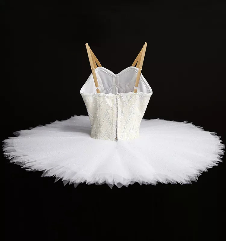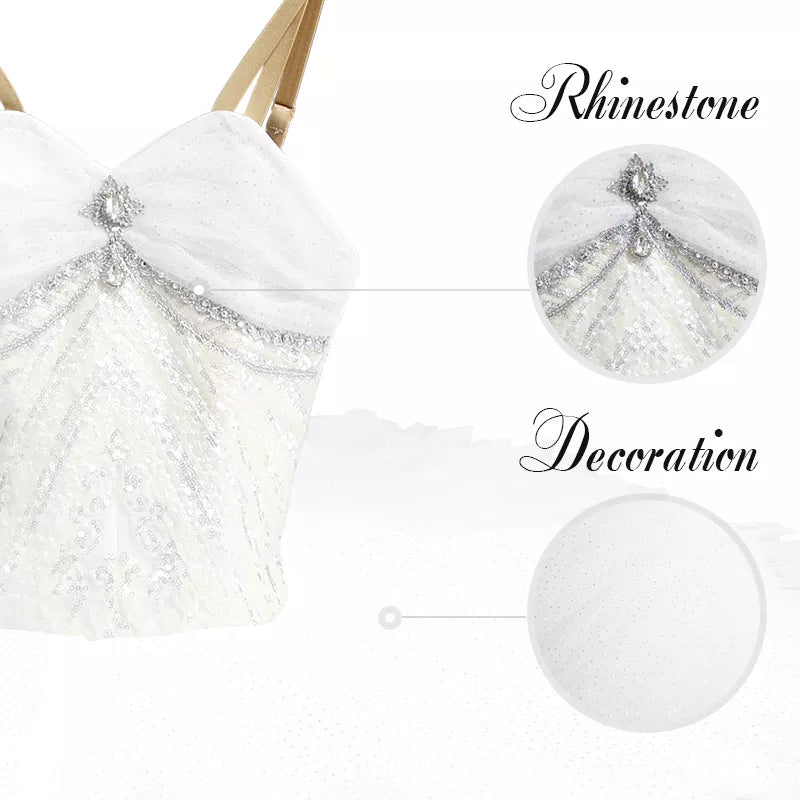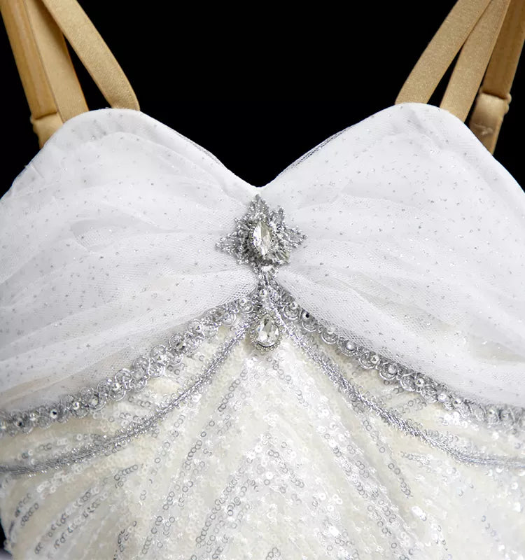 Der obere Teil des Kostüms besteht aus weißem und silbernem Brokat. Der Brustbereich des Tutus ist nach dem traditionellen Design für dieses Kostüm gefertigt: drapierter weißer Tüll mit Glitzer, ein zentraler Diamant mit einem Kristallanhänger und silberne Verzierungen.