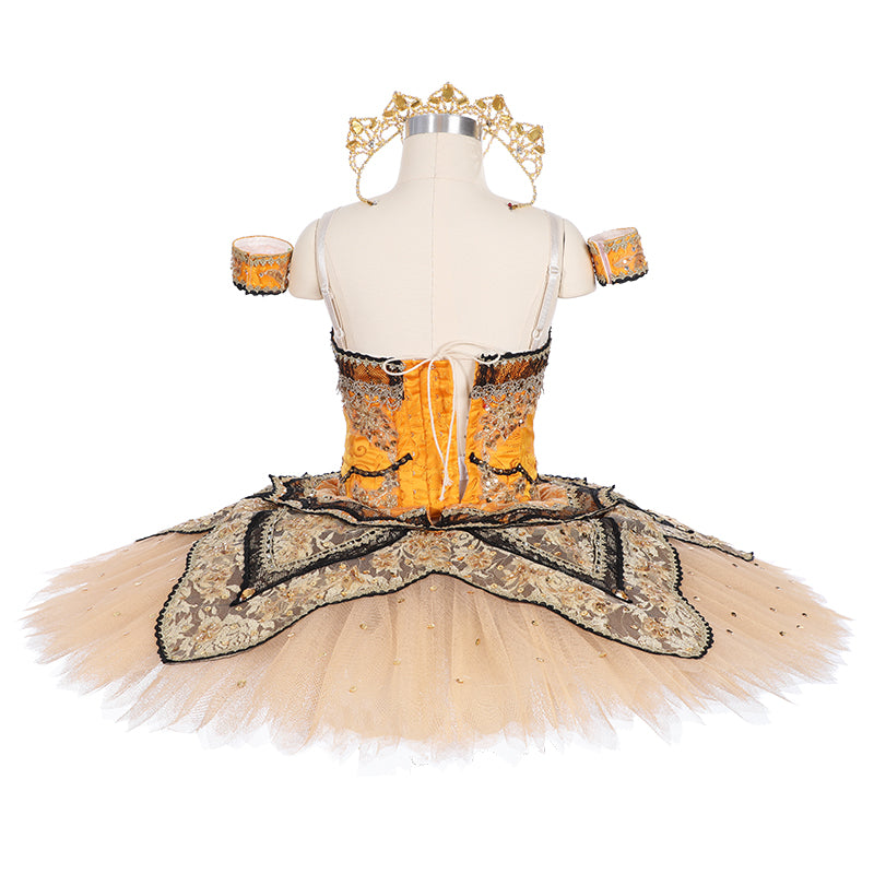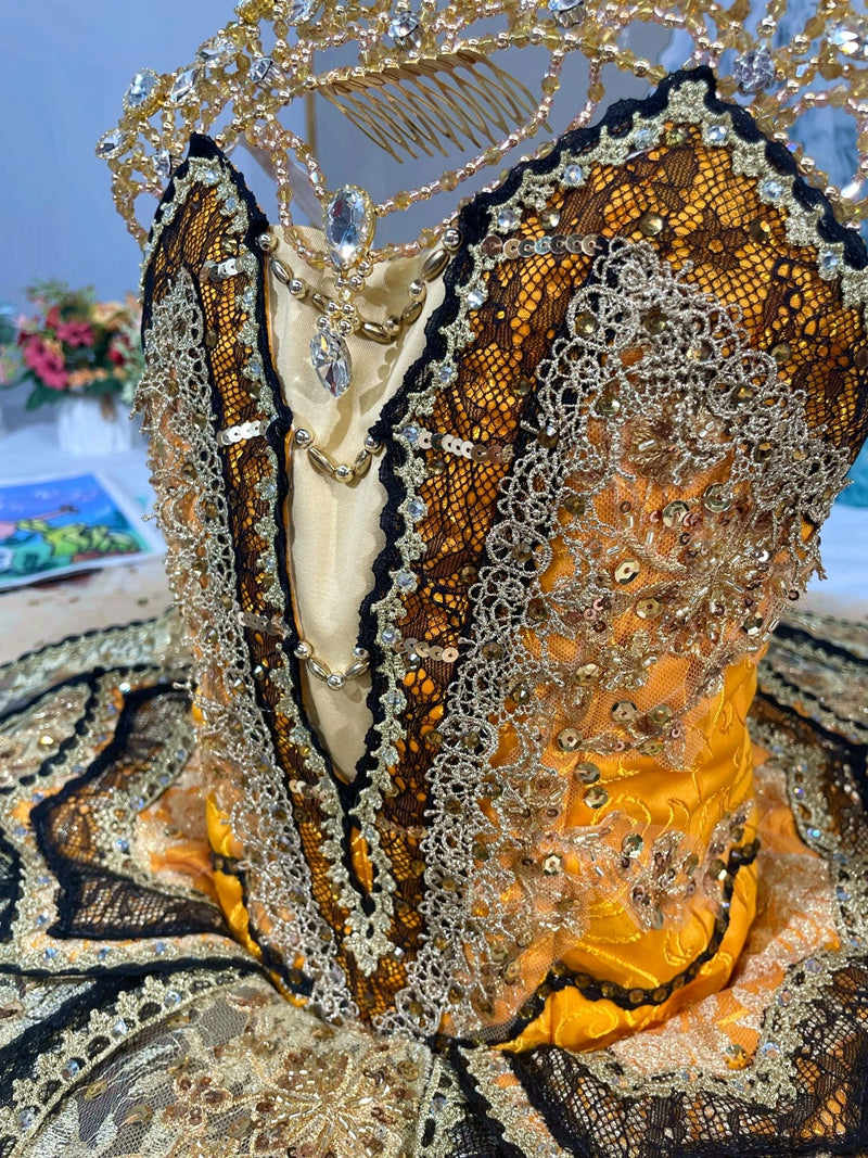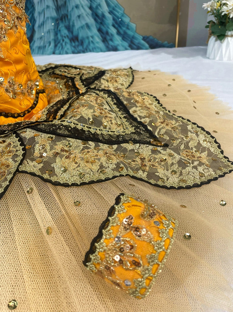 Dieses exklusive goldene Tutu von La Bayadere sieht aus wie ein kostbares indisches Juwel! Das goldene Satinmieder ist ein wahres Kunstwerk! Komplett verziert mit schwarzer Spitze, goldenen und silbernen Verzierungen, Perlen, Pailletten und Perlen. Armbänder in Form von Armbändern inklusive.