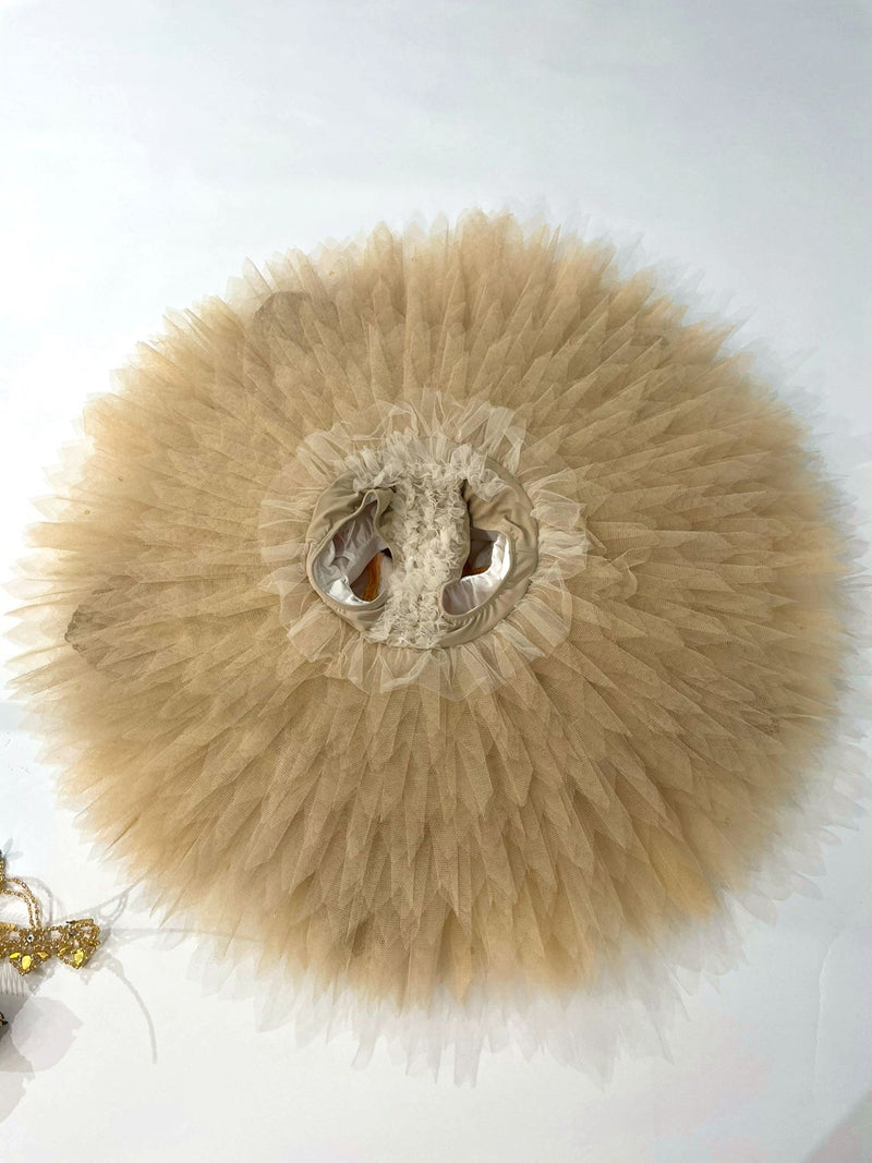 Der Tutu-Rock ist beige und verfügt über eine reiche Verzierung mit goldenen Pailletten sowie einen zum Oberteil passenden Tutu-Rock.