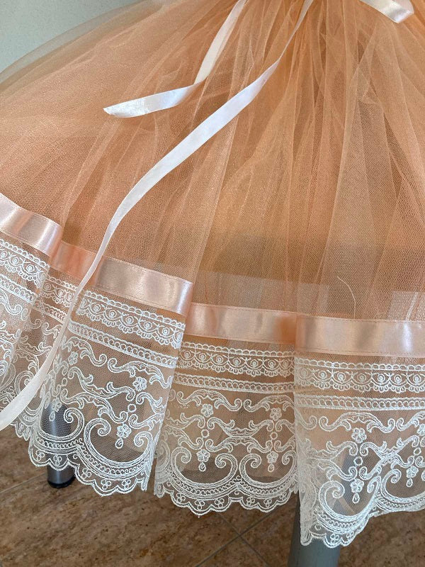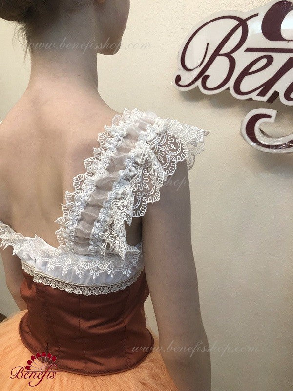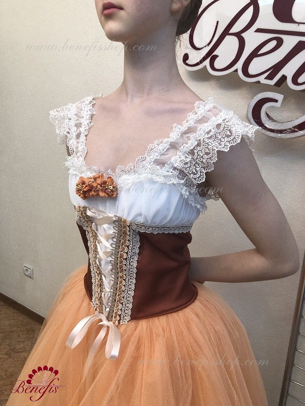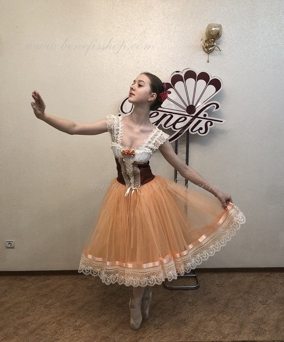 Dieses professionelle Bühnenkostüm wurde für die Rolle von La Fille Mal Gardee entworfen. Es wurde auf der Grundlage eines professionellen romantischen Tutu gefertigt. Die obere Schicht des Rocks besteht aus hellem, pfirsichfarbenem Tüll und hat eine breite Spitzenverzierung an der Unterseite der oberen Schicht des Rocks. Der untere Teil des Mieders ist braun und aus einem speziellen halbelastischen Stoff gefertigt. Das Unterhemd ist weiß und hat ein Spitzenmuster. Es ist mit Spitze, Satinbändern und Blumen verziert.