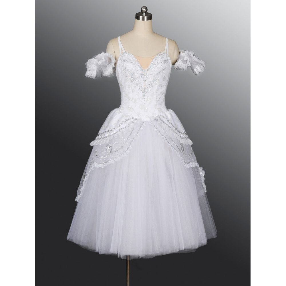 Dieses weiße, romantische Tutu ist für Ballette wie „La Sylphide“, „Les Sylphides“, „Giselle“ und „Grand Pas de Quatre“ entworfen. Das Oberteil weist ein silbernes Muster sowie silberne Verzierungen und Perlen auf. Das Oberteil wird hinten mit Haken und Ösen befestigt, damit es perfekt sitzt. Der romantisch lange Tutu-Rock ist aus extra weichem Tüll gefertigt und mit silbernen Mustern und zwei zusätzlichen Überzügen verziert.