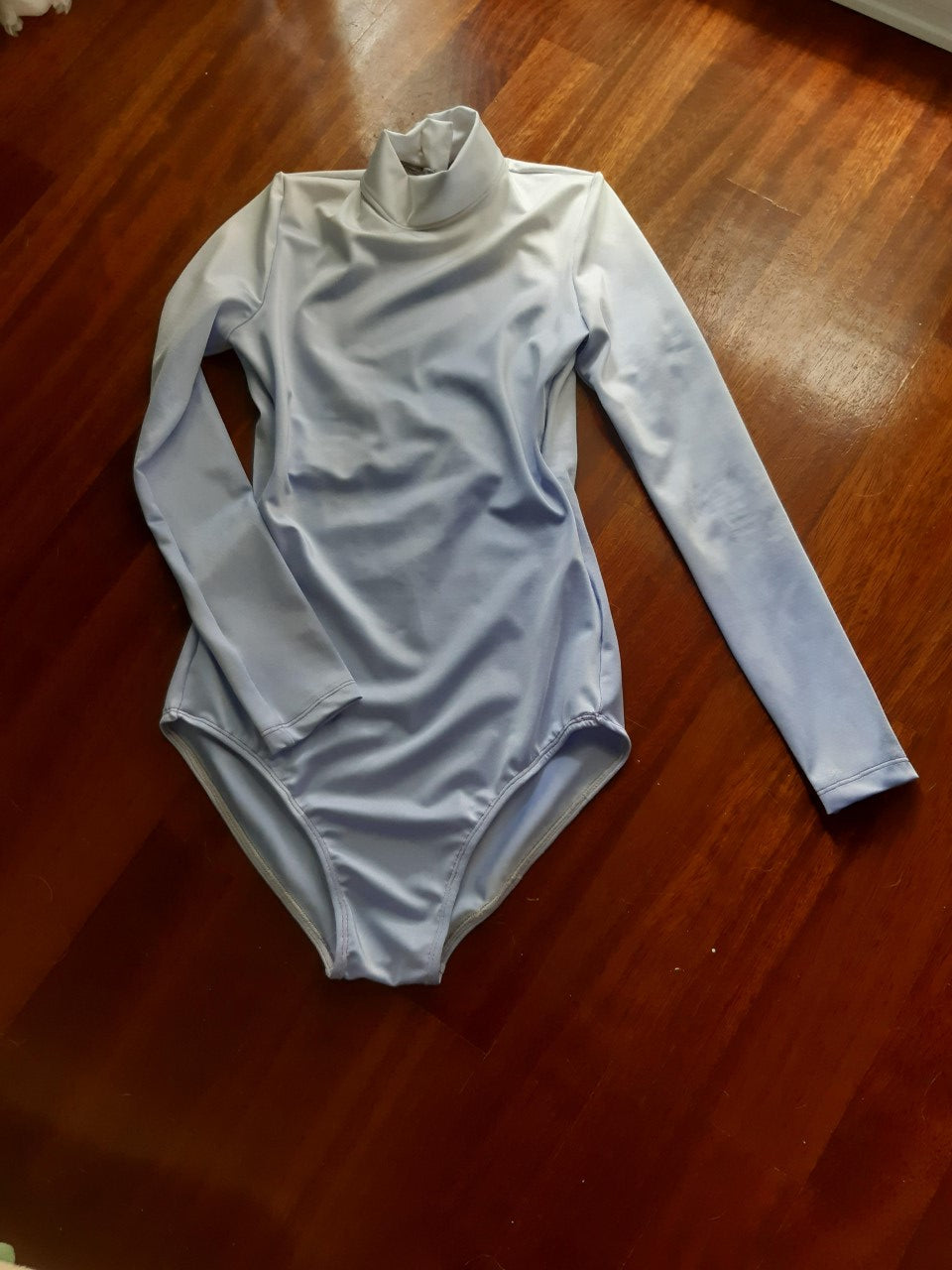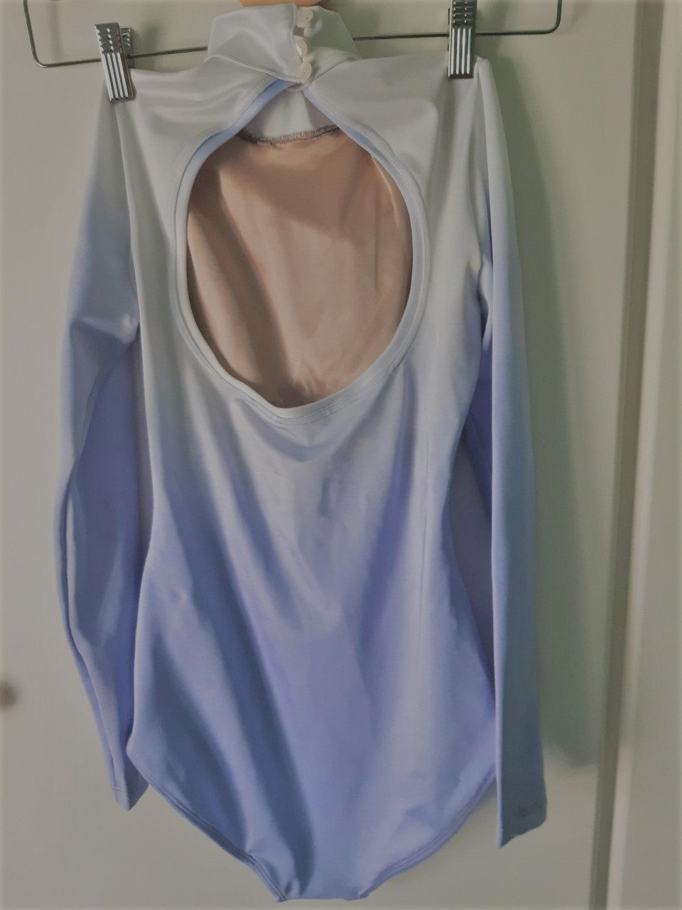 Dieser von Hand in einem wundervollen blassen Fliederton gefärbte Turnanzug hat einen Rollkragen, lange Ärmel und eine runde Öffnung auf der Rückseite.