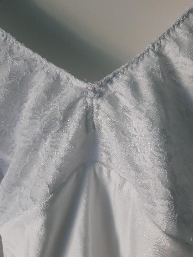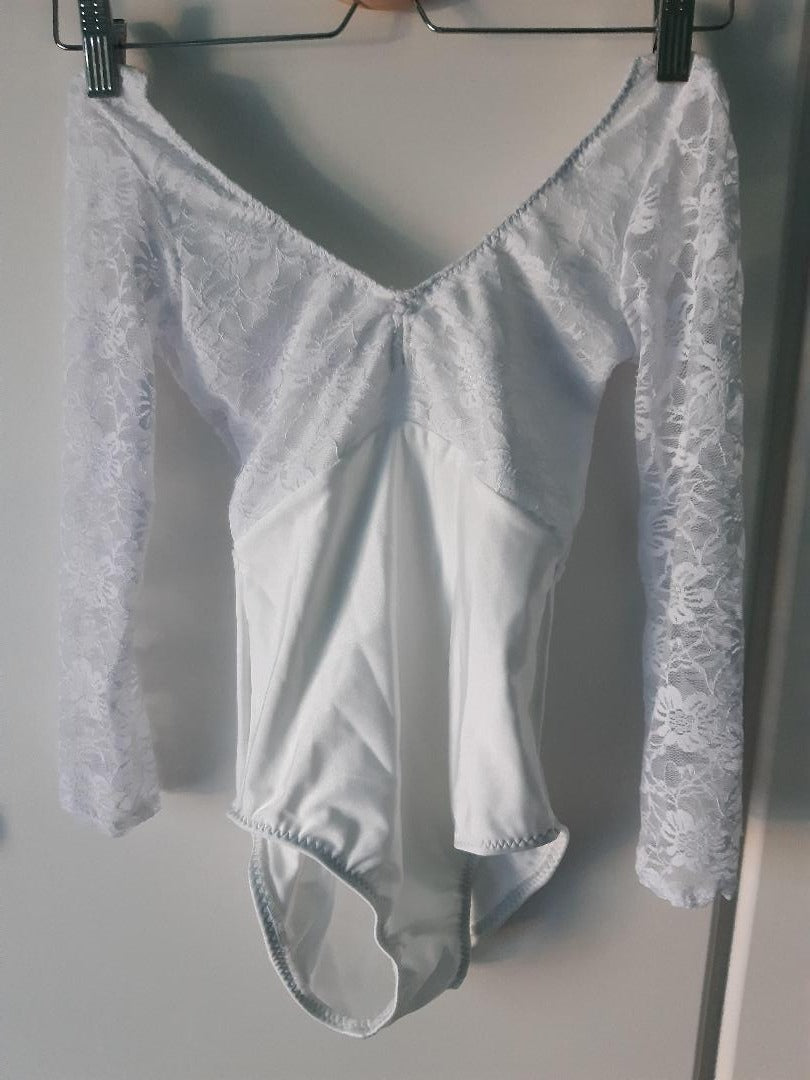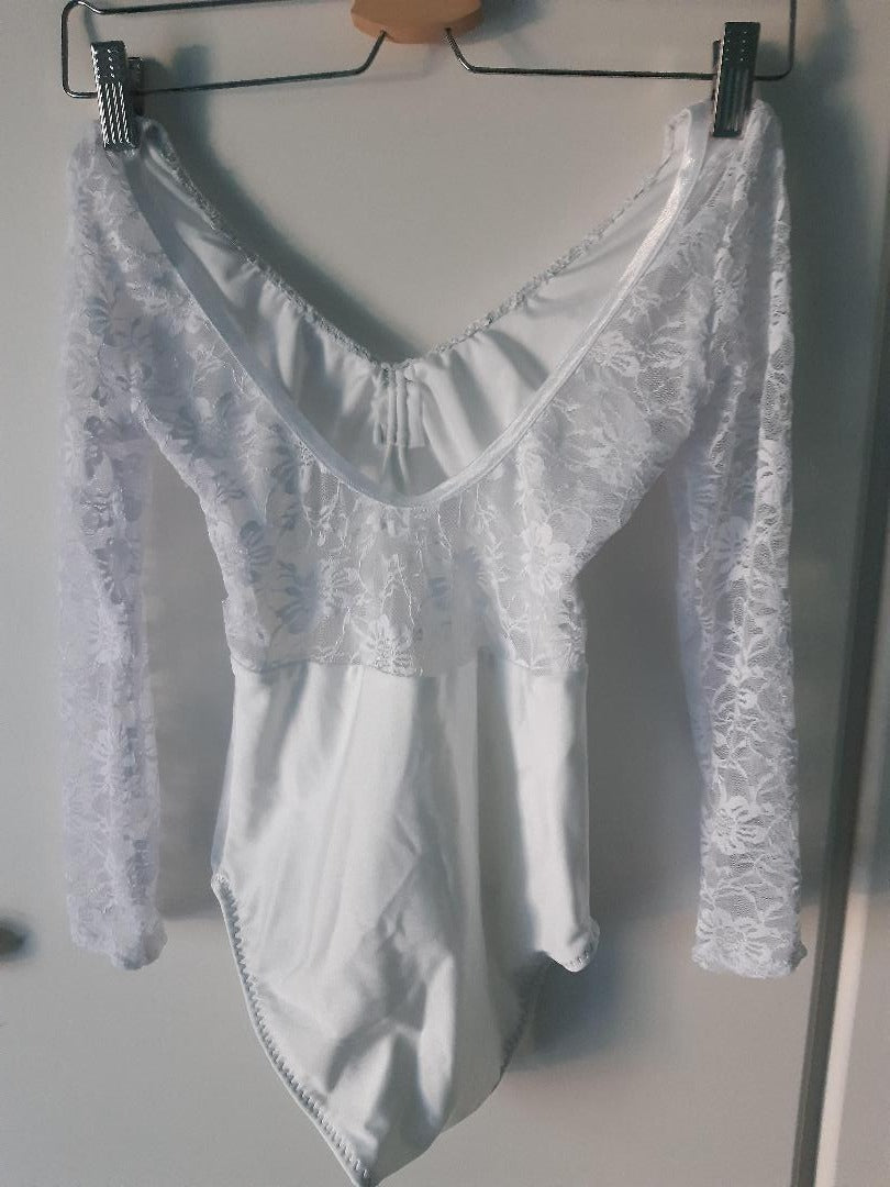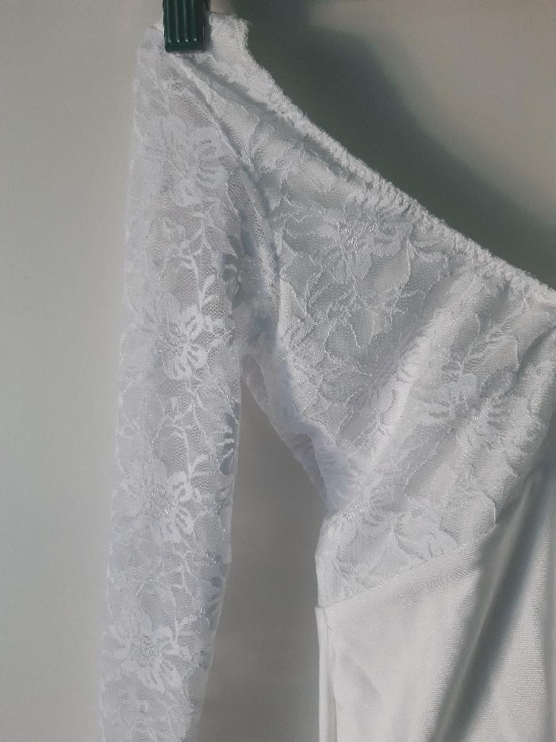 Dieser neu kreierte, weiße Turnanzug hat einen schmeichelnden V-Ausschnitt mit geraffter Vorderseite und einen tiefen V-Ausschnitt am Rücken. Der obere Teil des Turnanzugs sowie die Dreiviertelärmel bestehen aus weißer Spitze. Der Turnanzug ist vollständig gefüttert, sodass er nicht durchsichtig ist.
